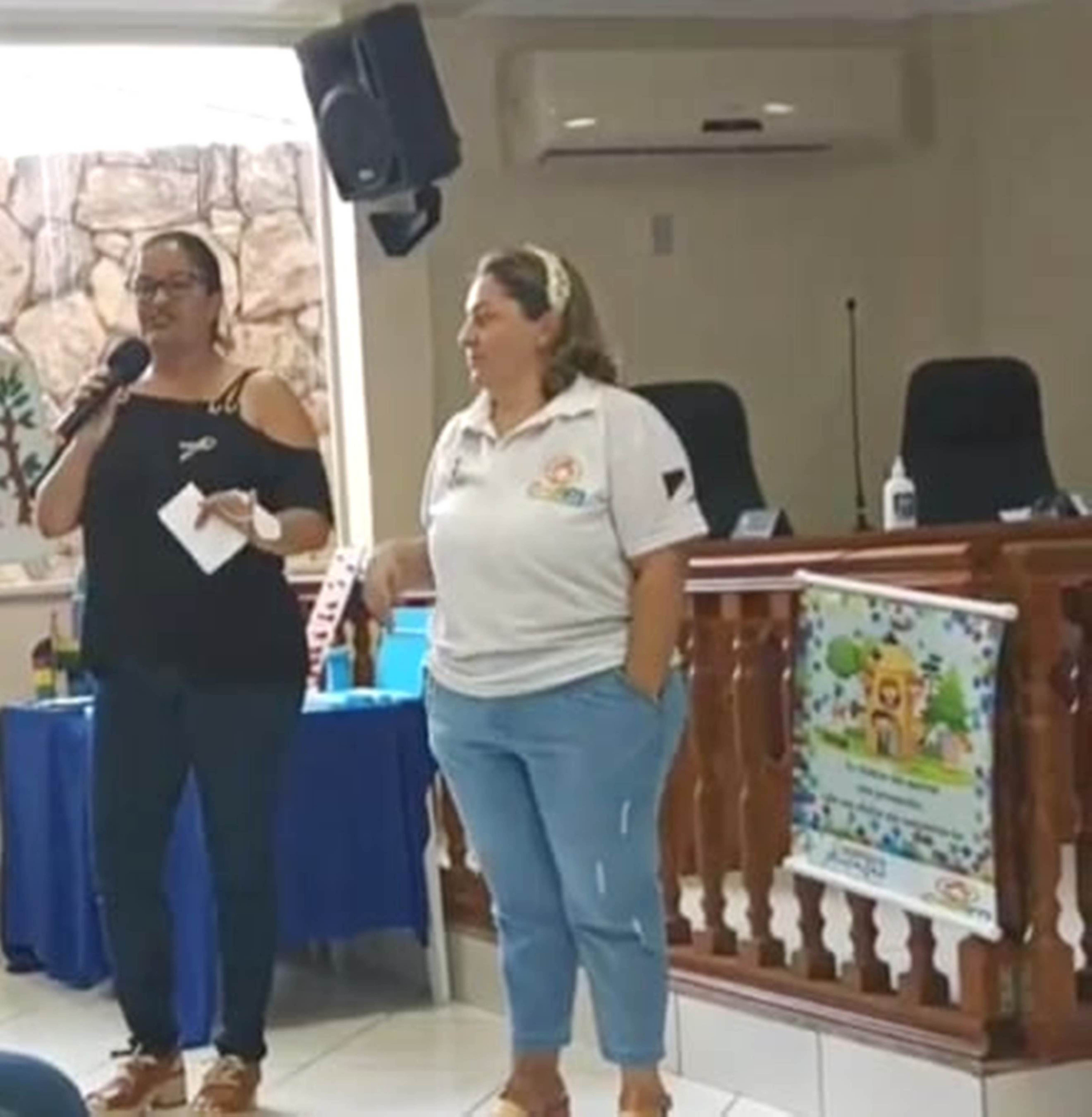 Integrantes da direção do CAEEM, a psicopedagoga Sheila Penavilla se dirige aos espectadores ao lado de Jeyne Tolentino
