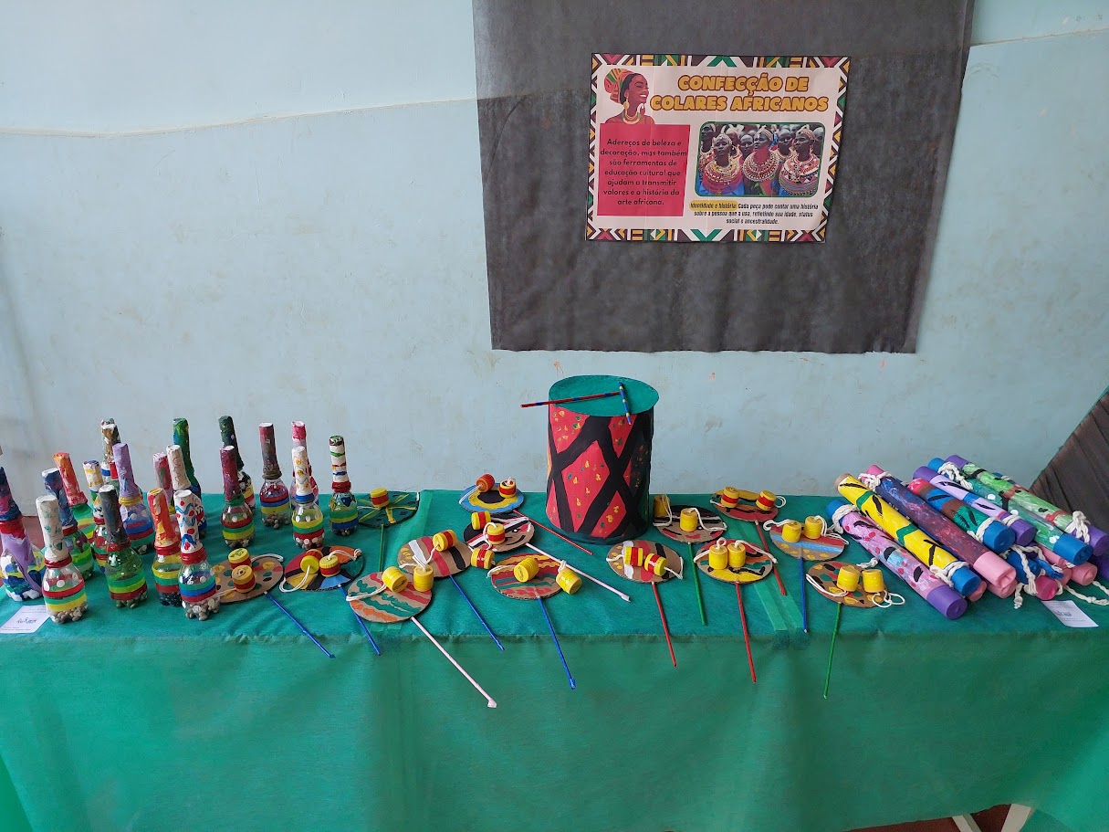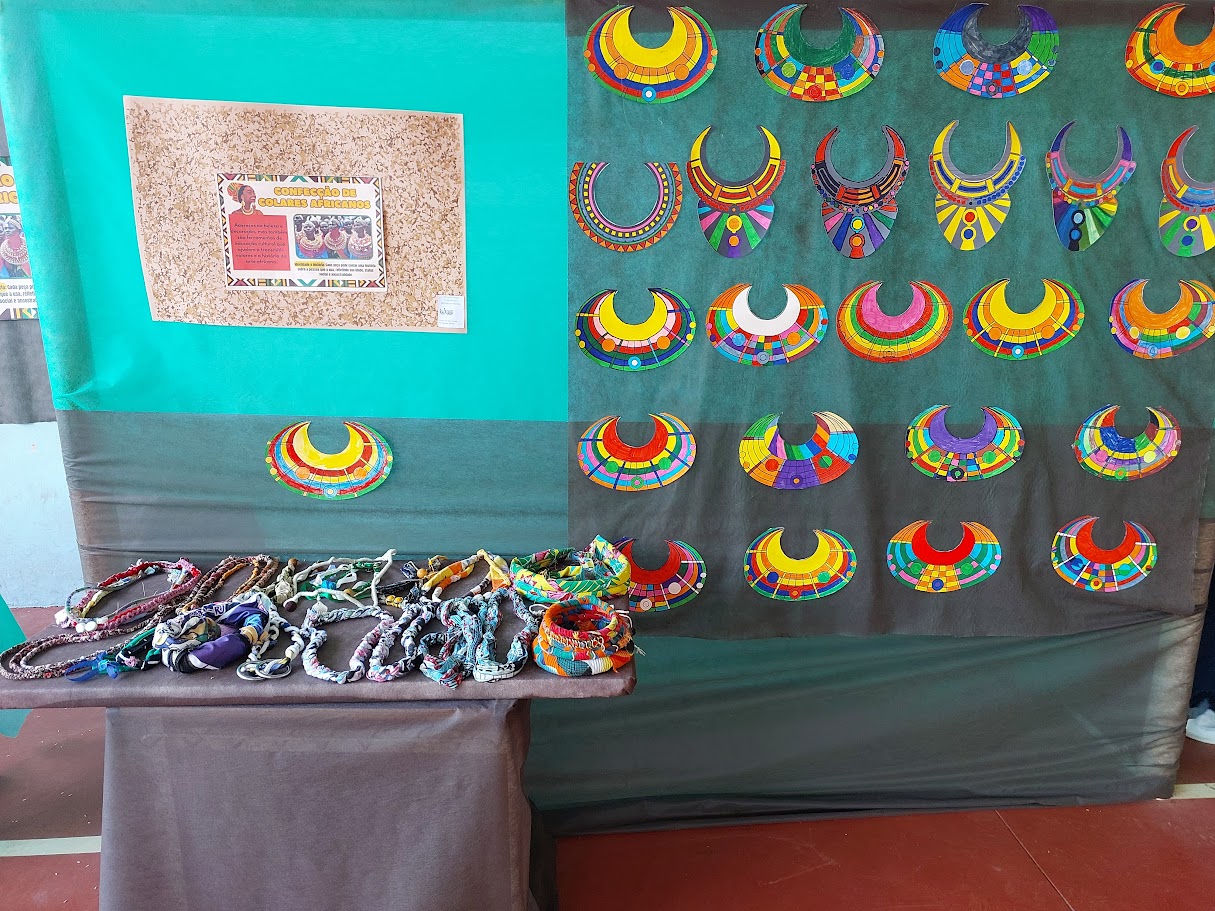 Alunos exploraram a estética e o significado de adereços tradicionais, como colares e vestimentas, reforçando o respeito e o reconhecimento da diversidade cultural
