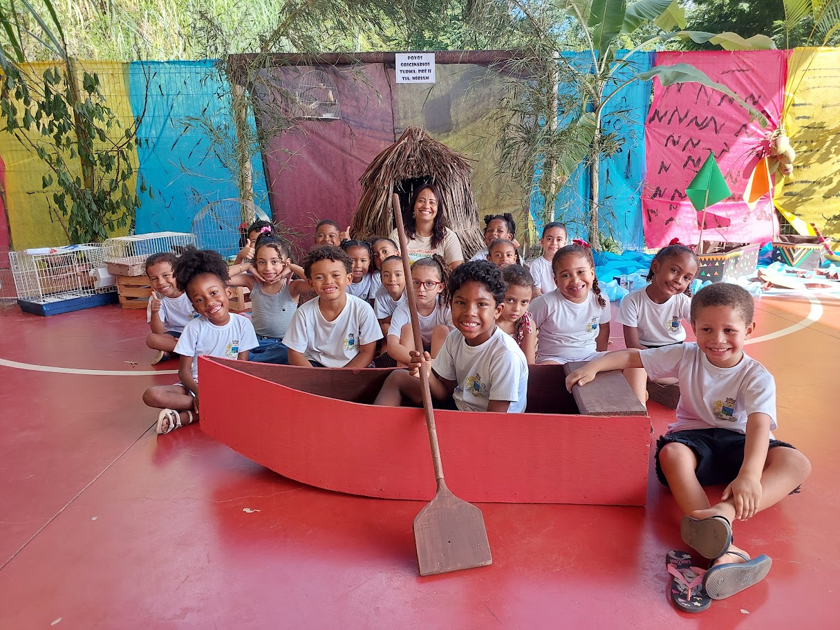 Alunos e professora posam em réplica de canoa, simbolizando a jornada de aprendizado e o mergulho nas histórias e tradições que compõem a identidade brasileira