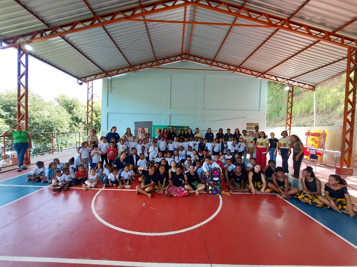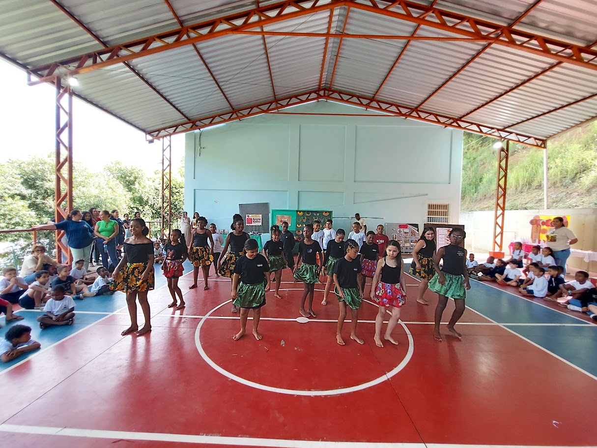 Grupo realiza apresentação cultural na quadra da escola, celebrando as tradições e ritmos dos povos originários e afrodescendentes como ponto culminante
