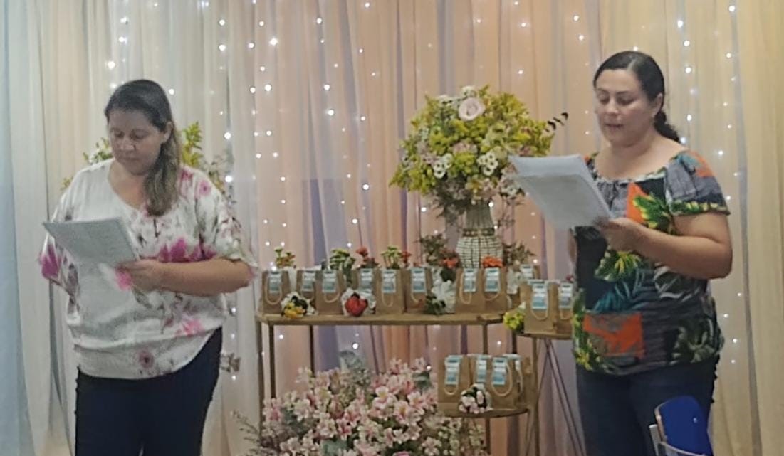 Diretora Viviam Badini e adjunta Renata Menezes comandando a cerimônia de recepção aos mestres da escola da Barreira
