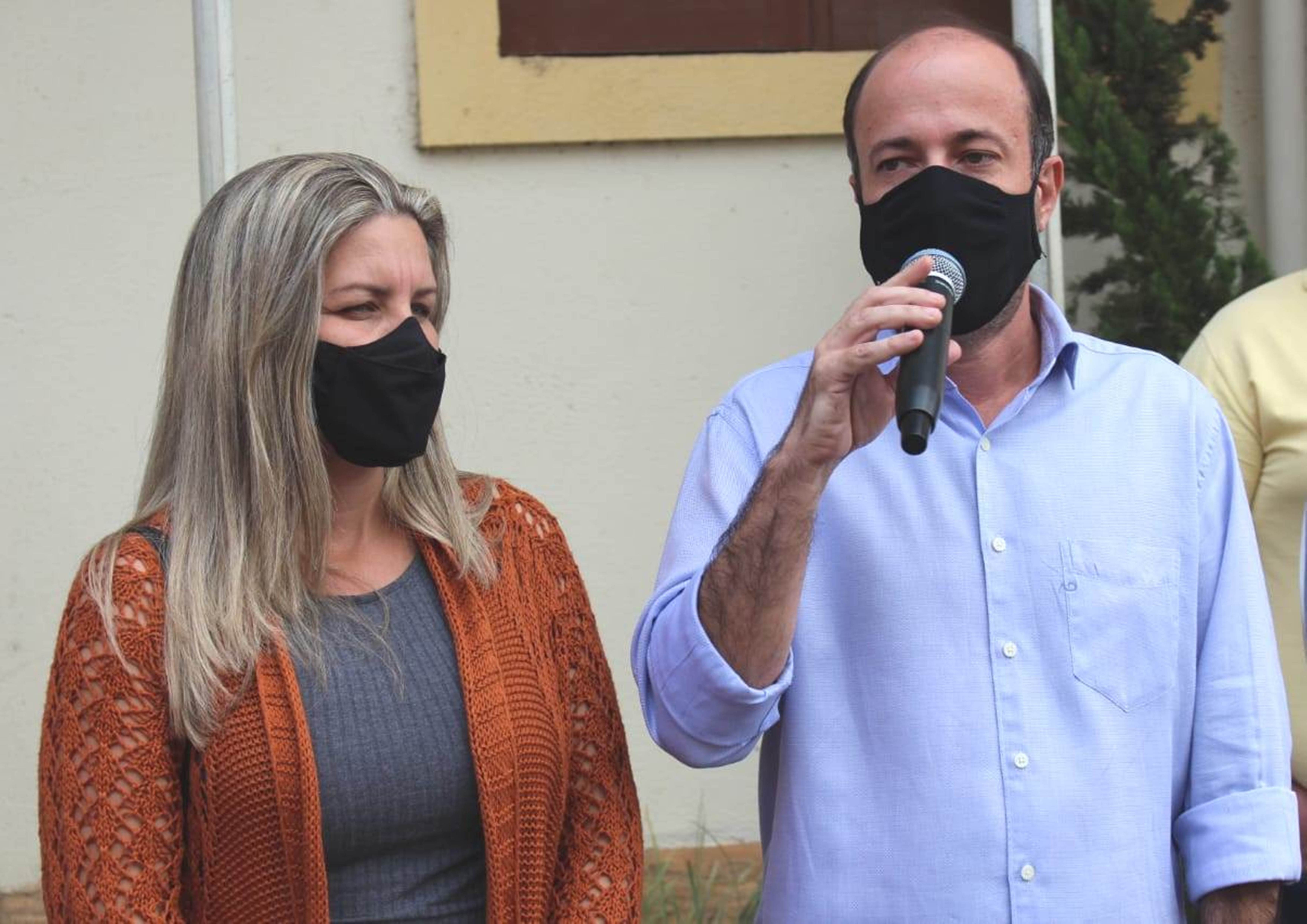 Prefeito Bruno Boaretto discursa ao lado da vice-prefeita Michelle Bianchini