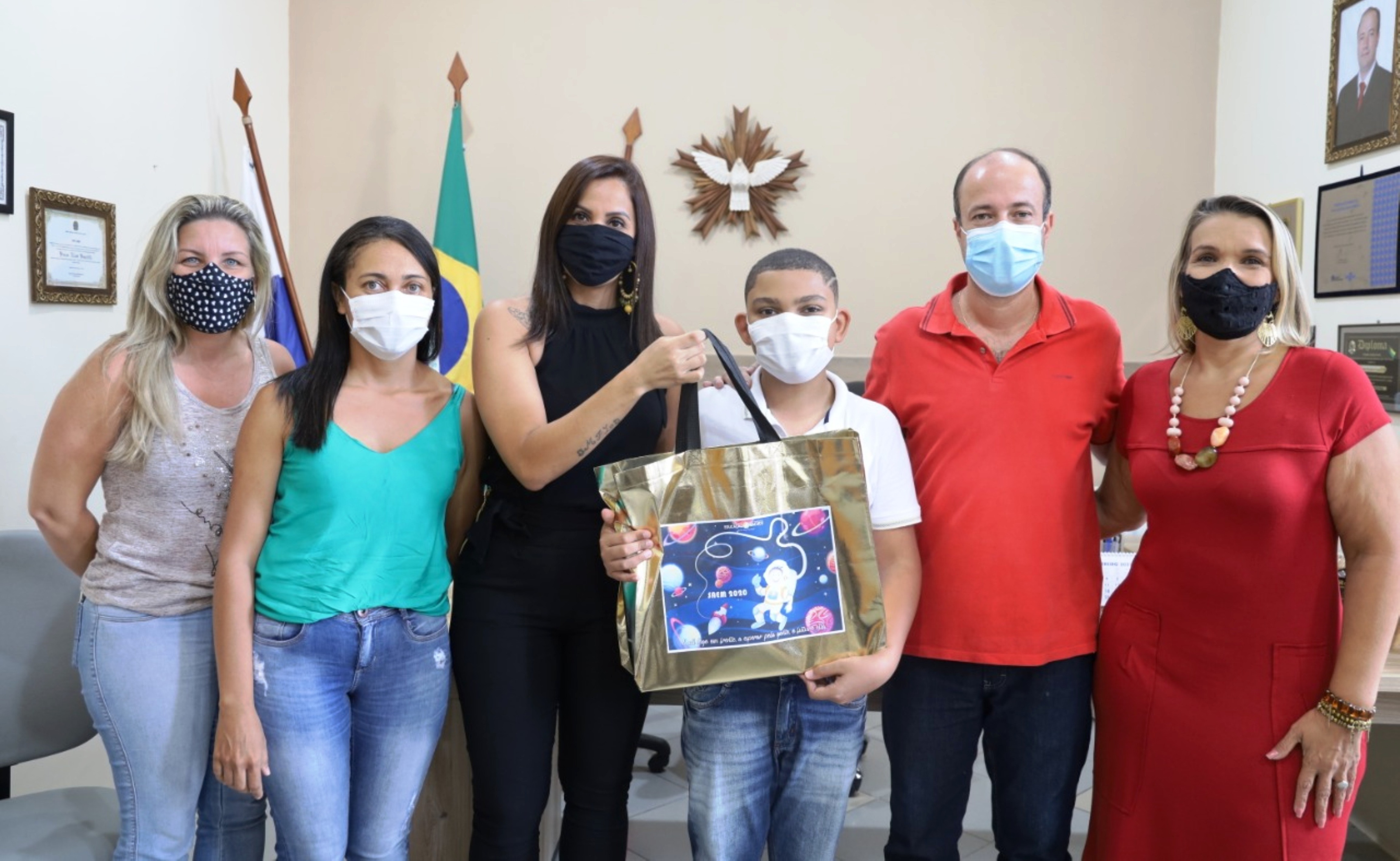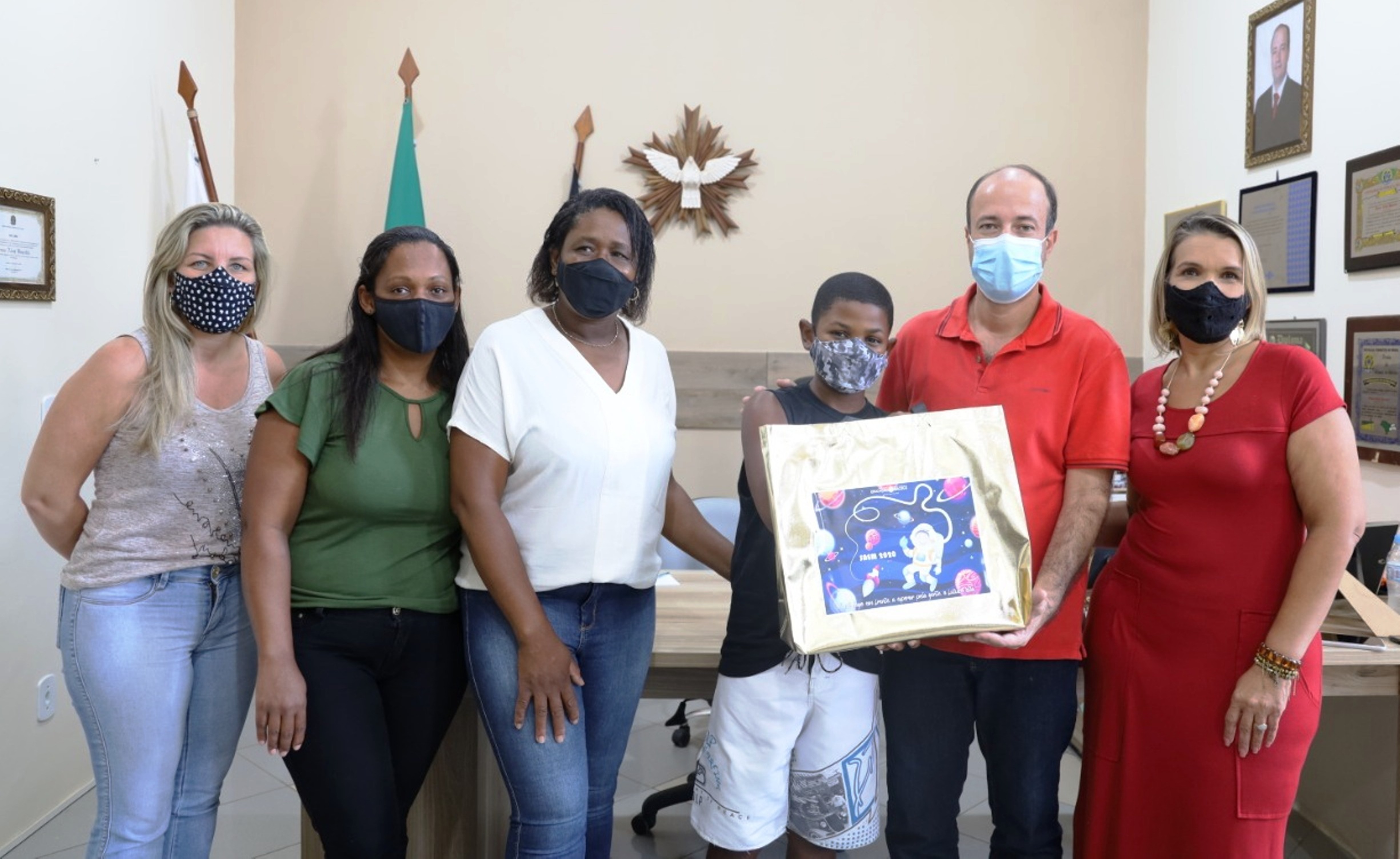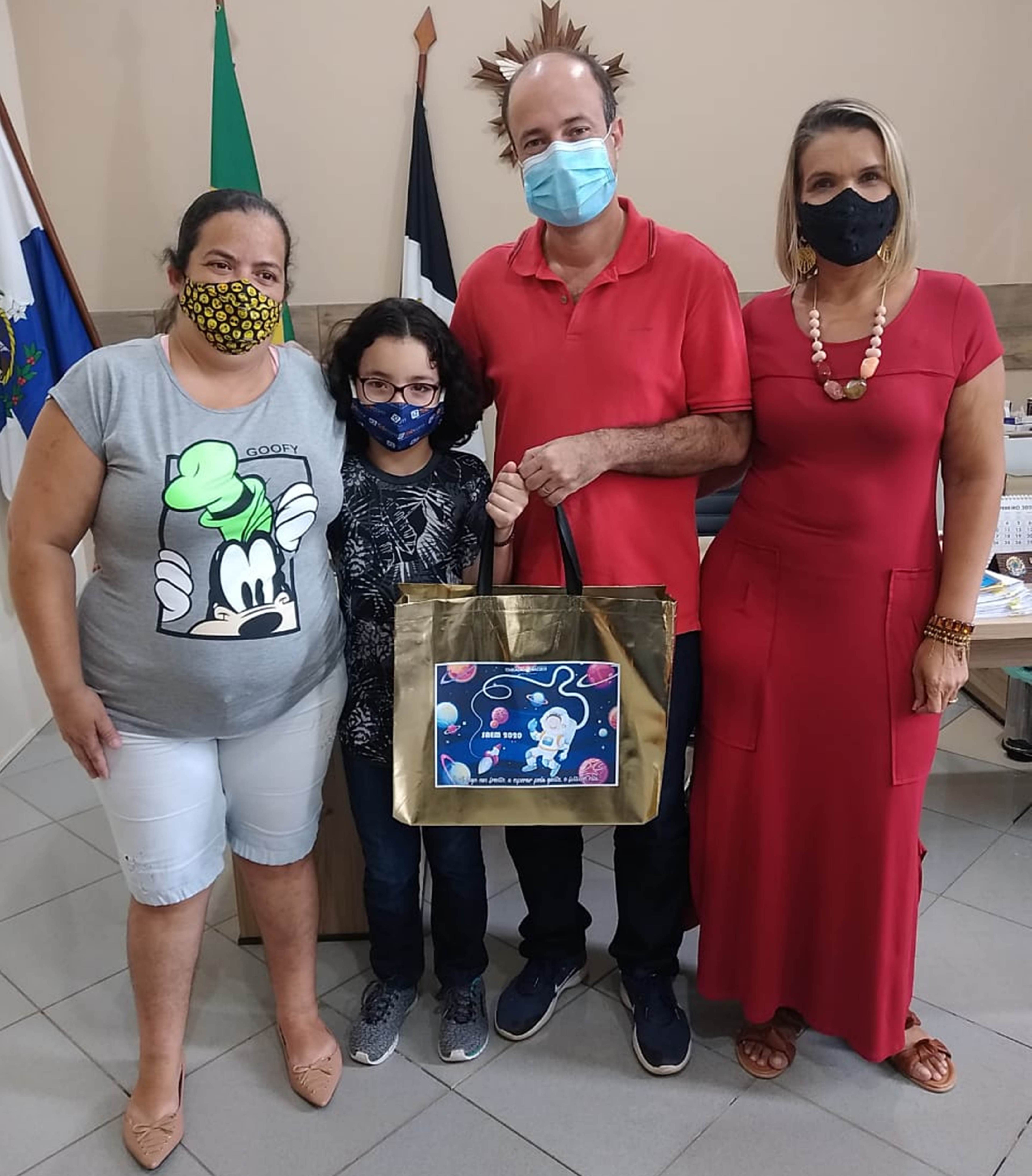 Jovem aluno João Lukas Miranda Malaquias recebe o prêmio com a família