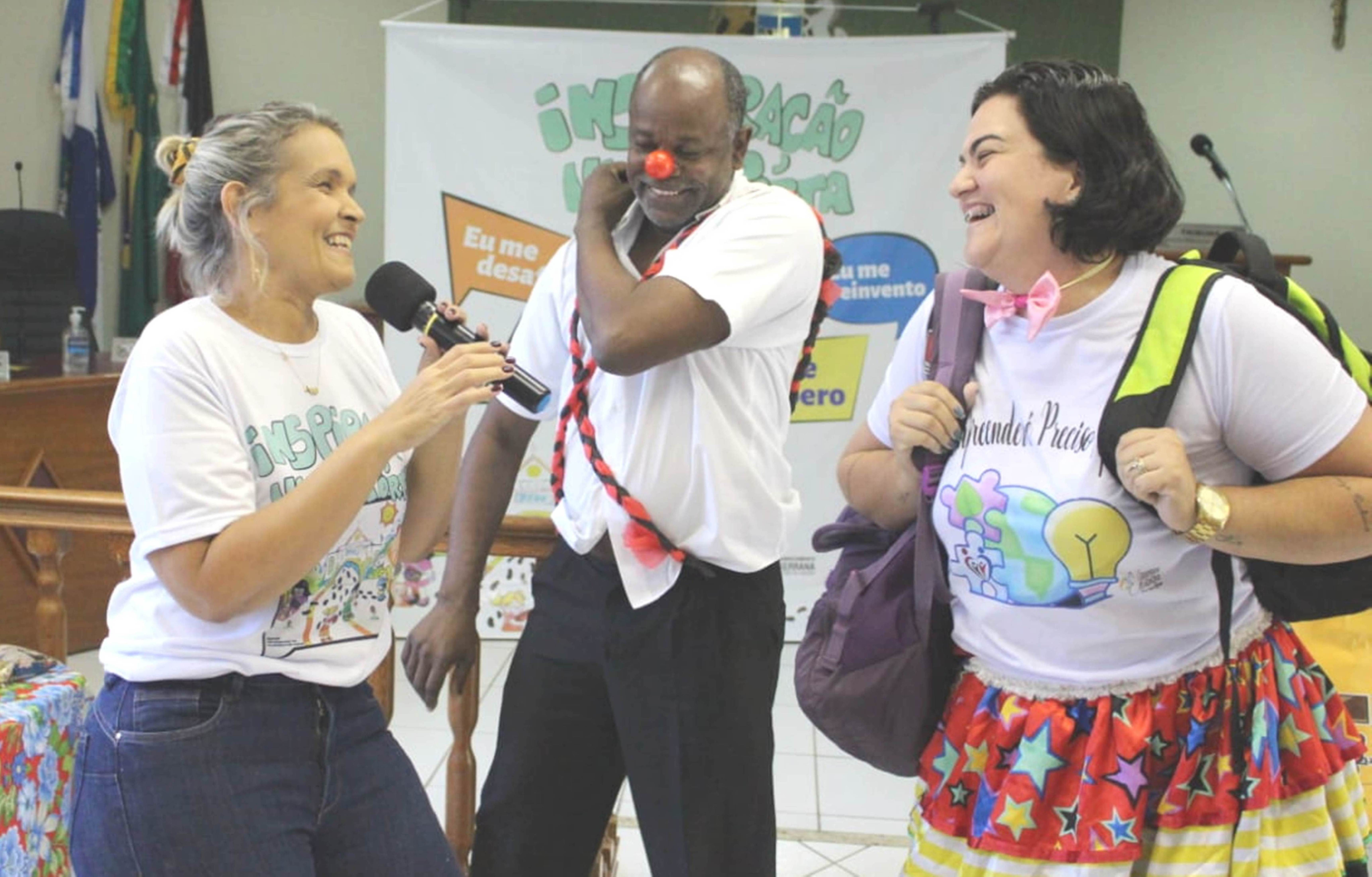 Secretária de Educação interagindo com os professores José Geraldo e Marina Espíndola, que encarnaram os personagens ‘Pechincha e Gastadeira’