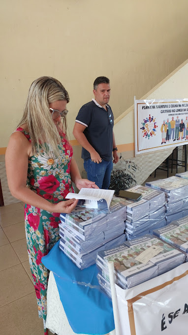 Observada pelo secretário de Governo, a prefeita folheia o Estatuto do Idoso que foi entregue aos usuários da Secretaria de Envelhecimento Saudável