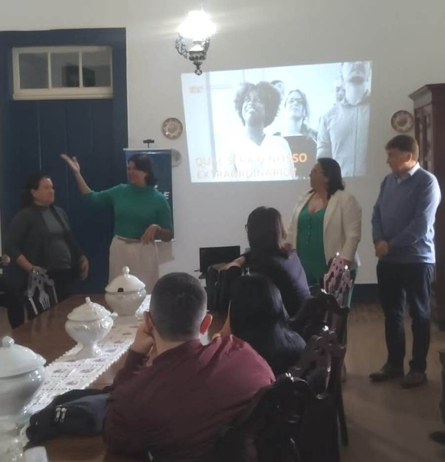 Secretária de Educação de Macuco (quarta da esquerda para a direita) entre profissionais educacionais da cidade e representantes do SEBRAE