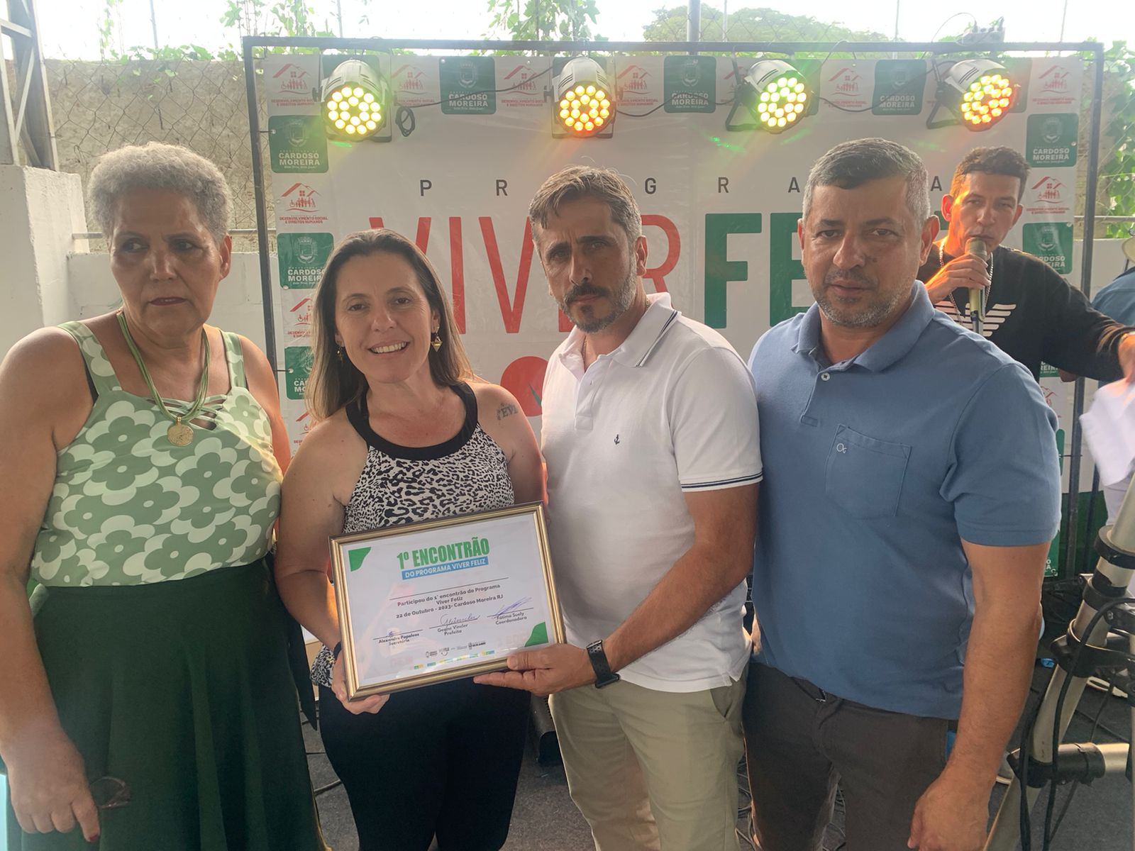 Subsecretária Elaine Lopes recebe o certificado de participação das mãos do secretário Alexandre Papaleos, do subsecretário e da coordenadora do Projeto Viver Feliz