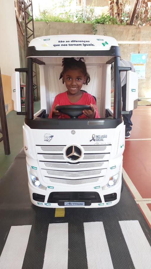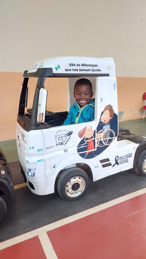 Sorriso no rosto expressa a felicidade do pequeno estudante ao simular a condução do caminhãozinho elétrico