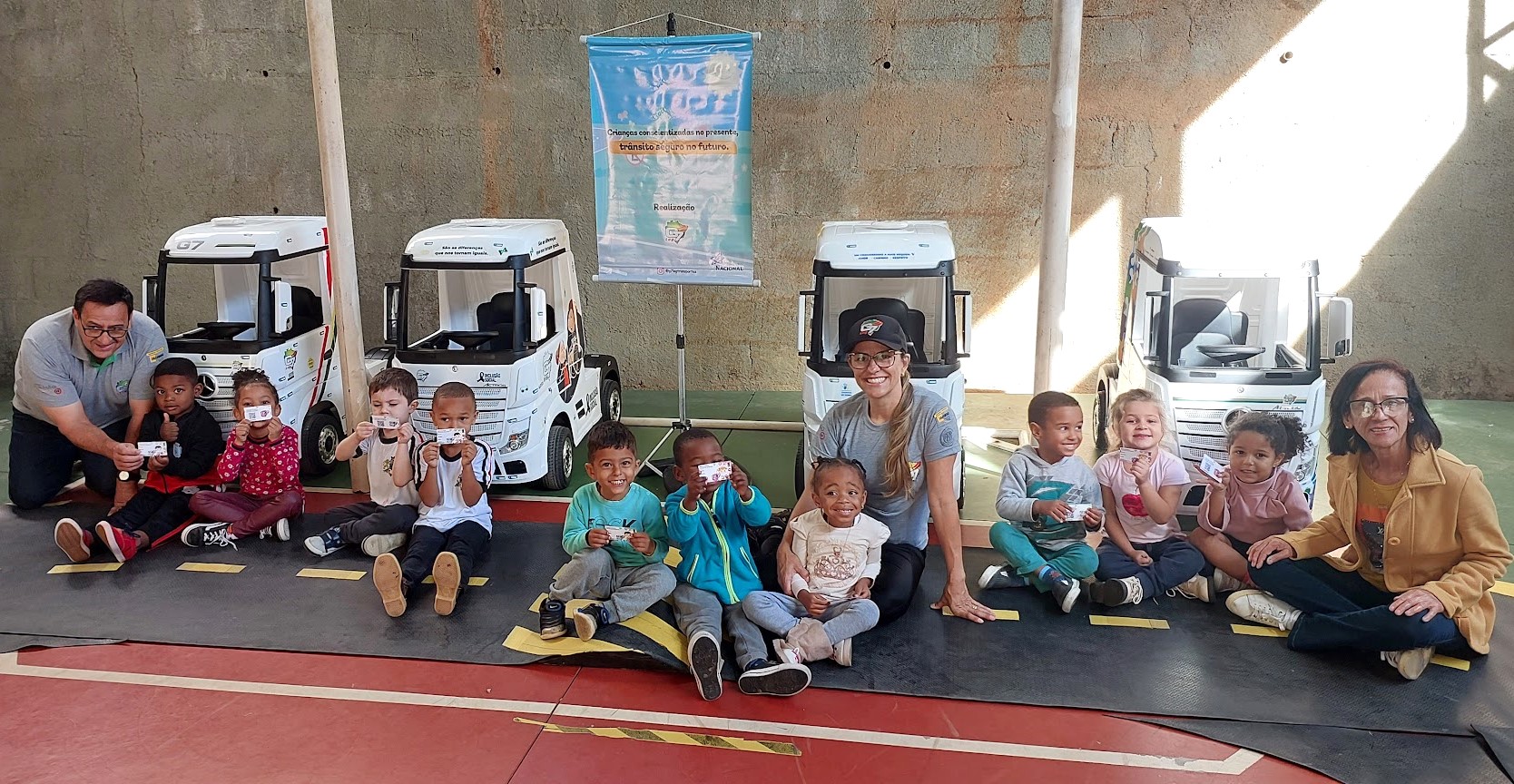 Garotada exibe orgulhosa as carteirinhas infantis de habilitação que ganharam após a conclusão do projeto