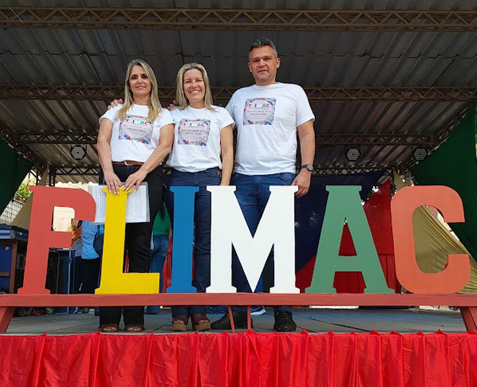 Trio anfitrião da Festa Literária de Macuco, secretária de Educação Claudia Vogas, prefeita Michelle Bianchini e secretário de Governo João Vitor Pontes