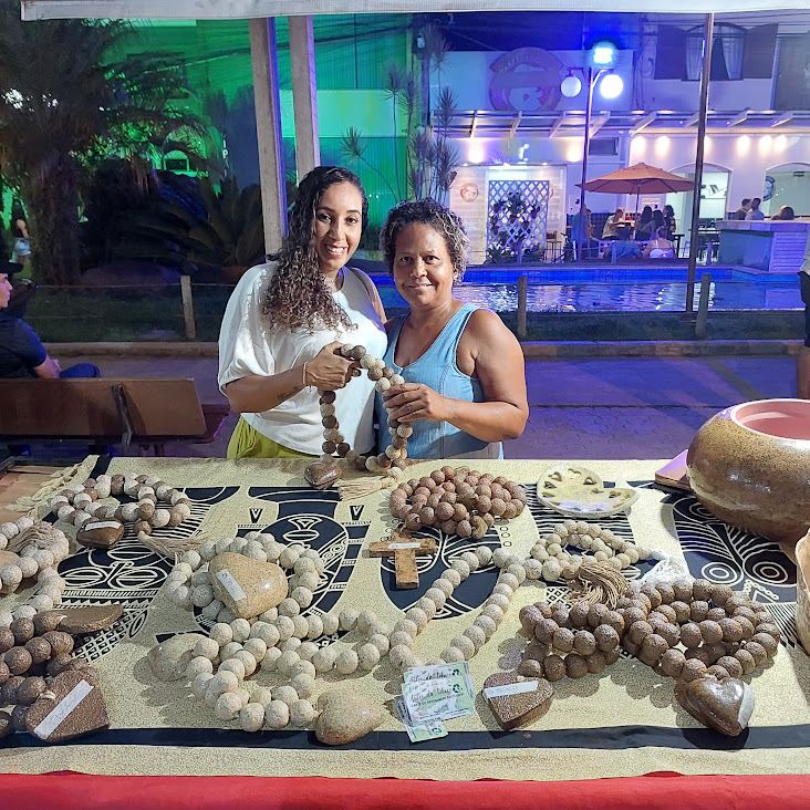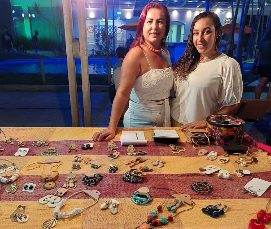 Junto da representante da Sala do Empreendedor Fernanda Diniz, a diretora de Cultura Micaelle Mattos numa das barracas que expuseram seus produtos