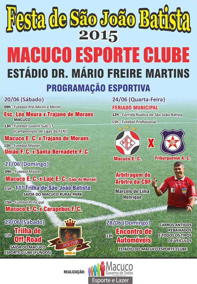 Outra novidade para esse jogo bastante aguardado pelos torcedores locais será a presença do árbitro da Confederação Brasileira de Futebol (CBF), Marcelo de Lima Henrique, que atualmente atua pela Federação Pernambucana de Futebol e tem sido destaque nas arbitragens de grandes jogos pelo Campeonato Brasileiro 2015. “Macuco terá a oportunidade de homenagear seu padroeiro em grande estilo também dentro dos gramados. Estou certo que serão momentos marcantes para nossos munícipes e agradeço ao prefeito Félix Lengruber pelo apoio que nos tem ofertado, inclusive por ter nos auxiliado na vinda do Friburguense e do árbitro Marcelo”, colocou o secretário Diogo Latini.