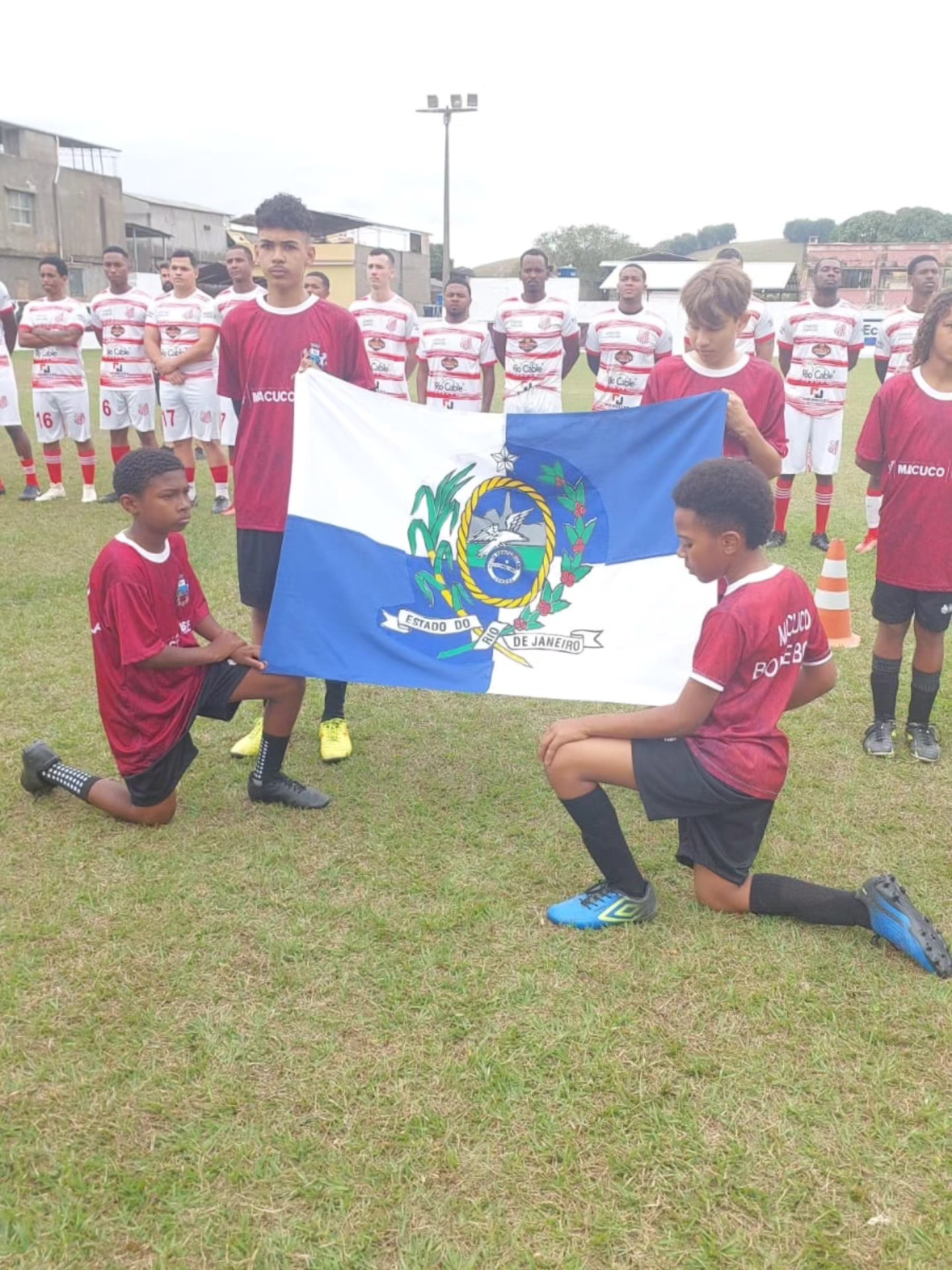 Garotada destacando o pavilhão do Estado do Rio de Janeiro durante a Solenidade de Abertura do Campeonato Municipal 2025