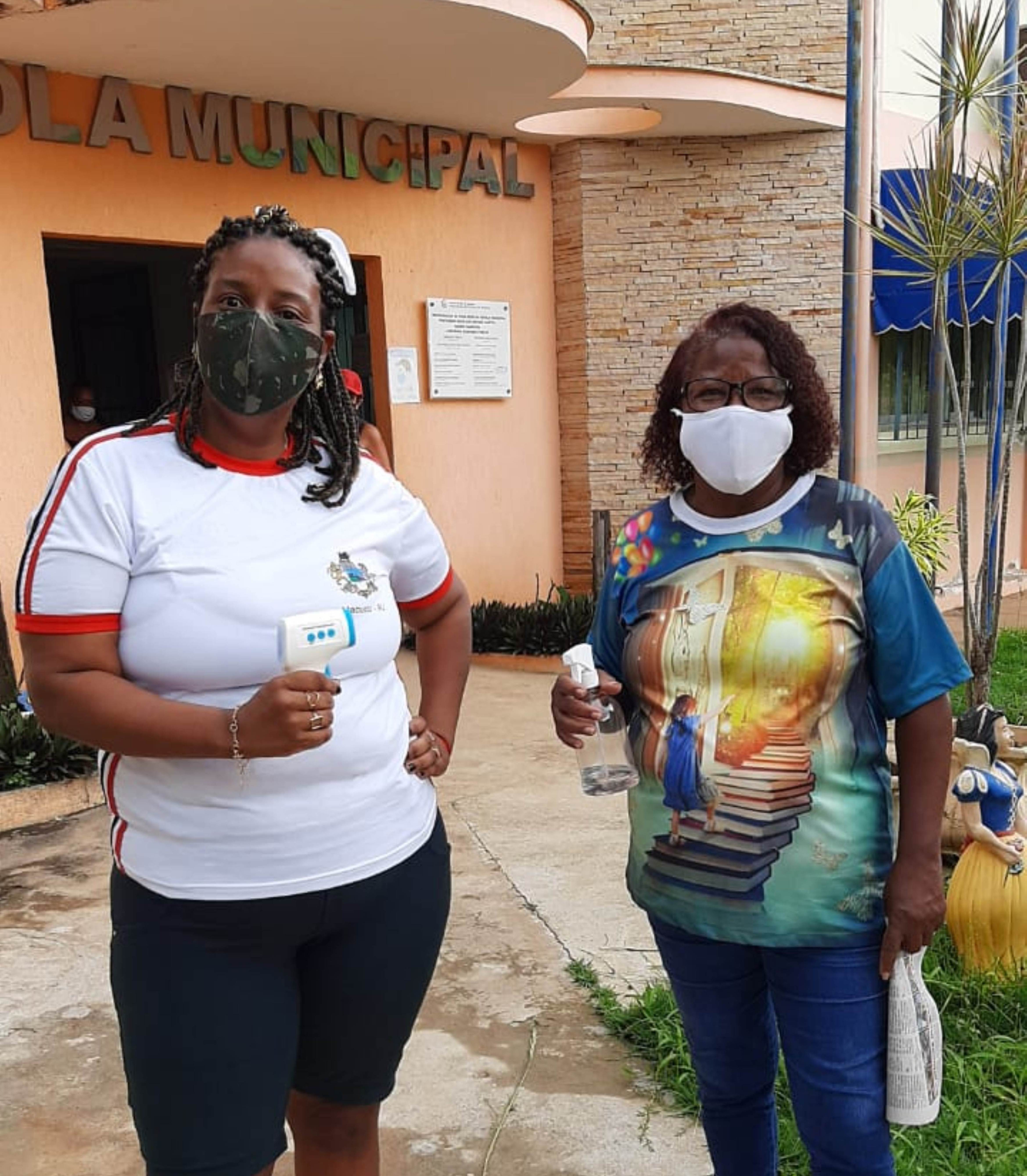 Profissionais de educação aferem temperatura e garantem a higiene das mãos