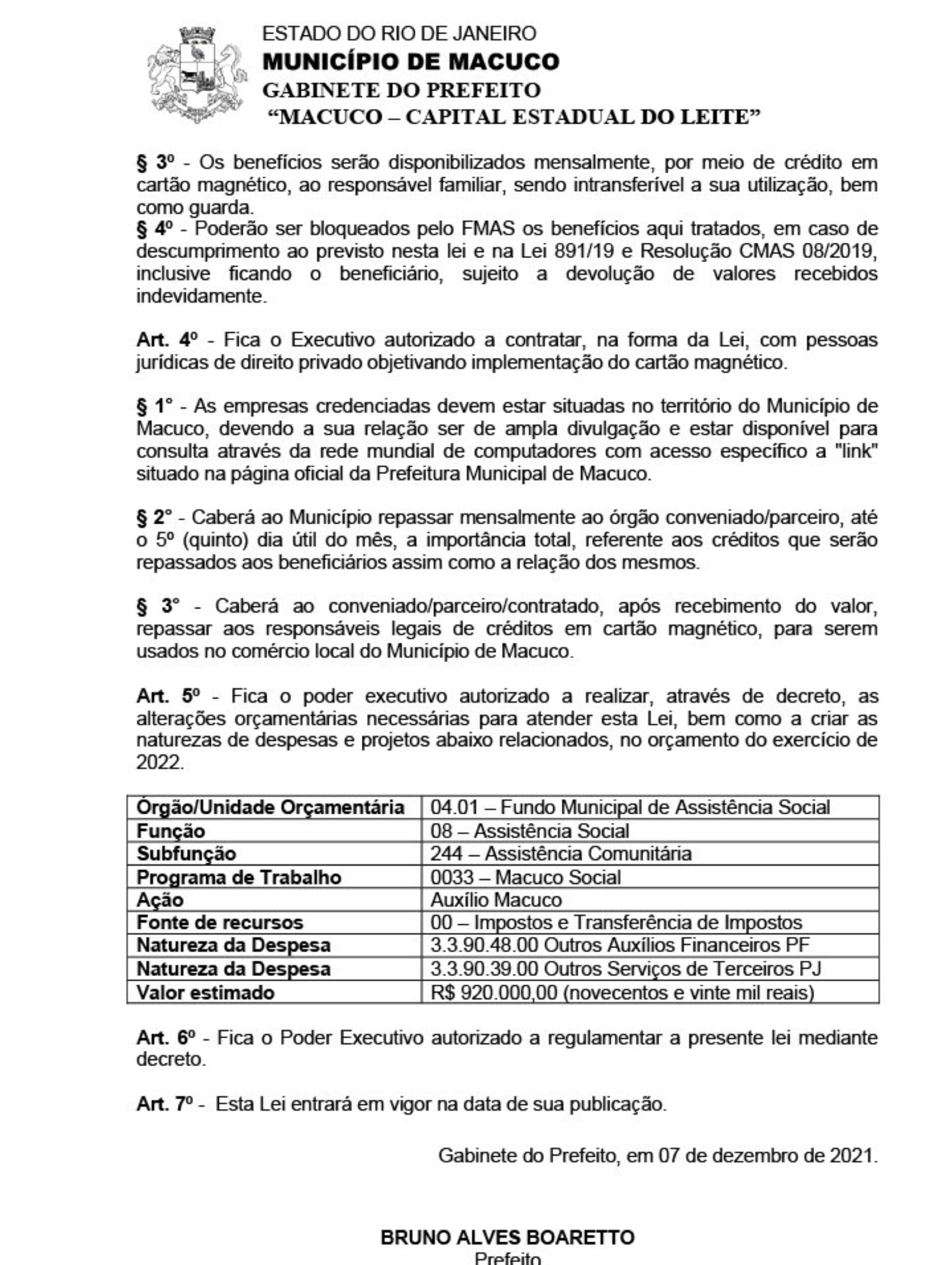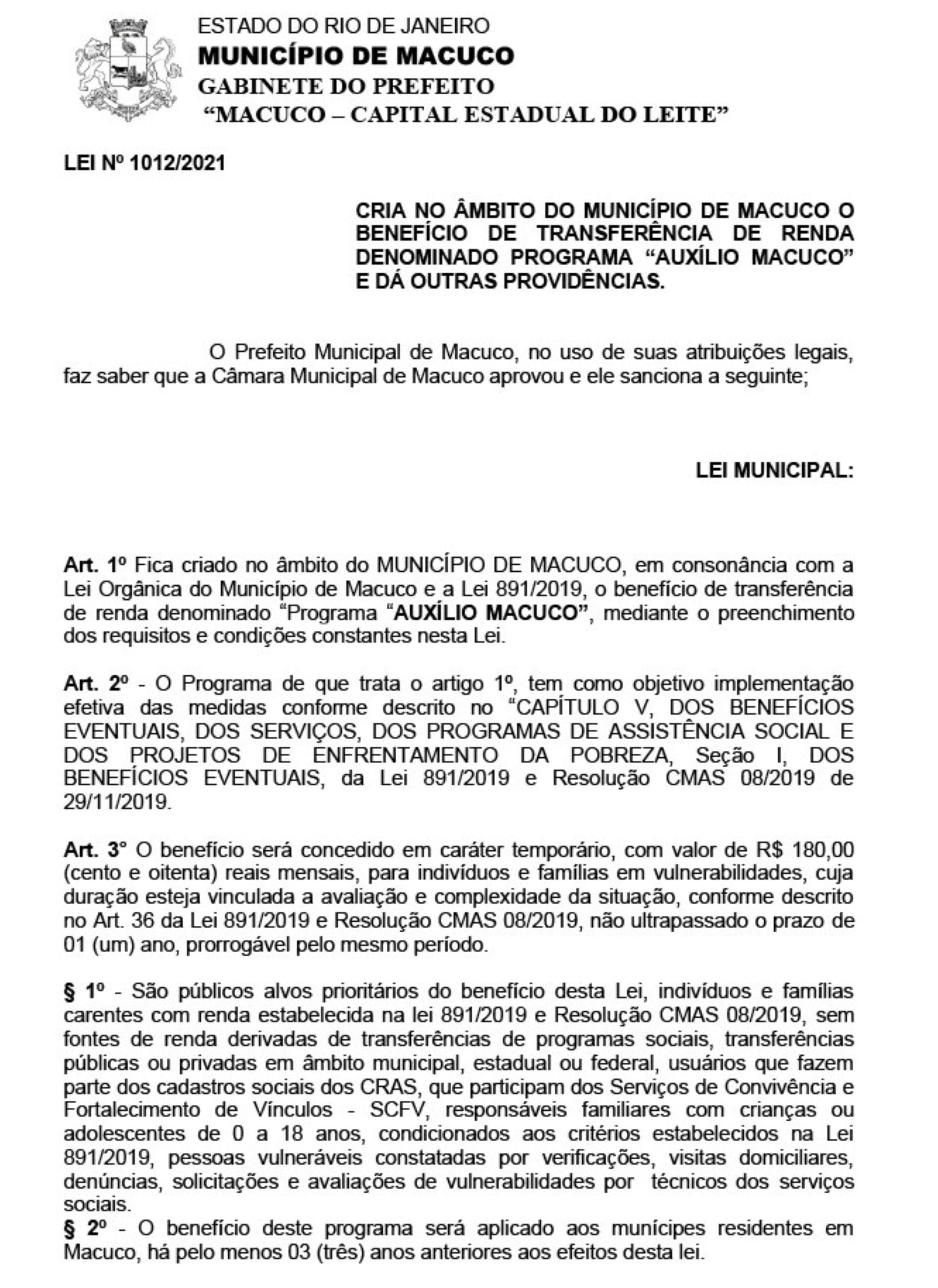 Com a aprovação pelo Poder Legislativo no final do ano passado, a Prefeitura Municipal criou a Lei Nº 1012/2021 instituindo o ‘Auxílio Macuco’