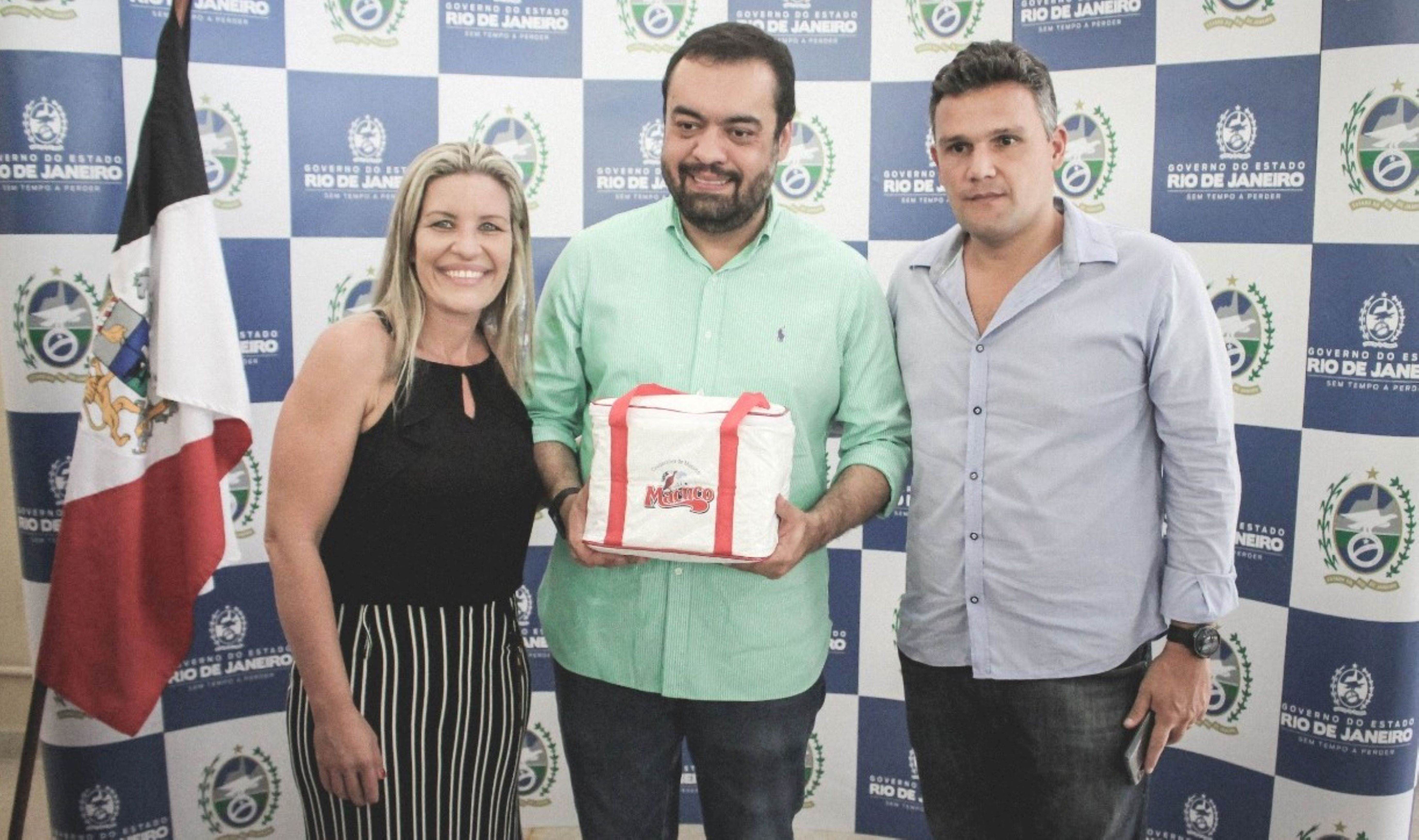 A prefeita Michelle Bianchini e o secretário de Governo e Gestão João Vitor presentaram Cláudio Castro com produtos da Cooperativa de Macuco