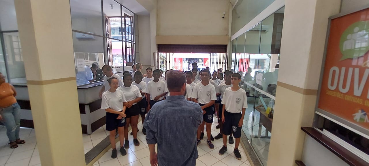 Em forma, já no interior da Prefeitura de Macuco, garotada aguarda o início da visitação para conhecer o andamento da Gestão Municipal