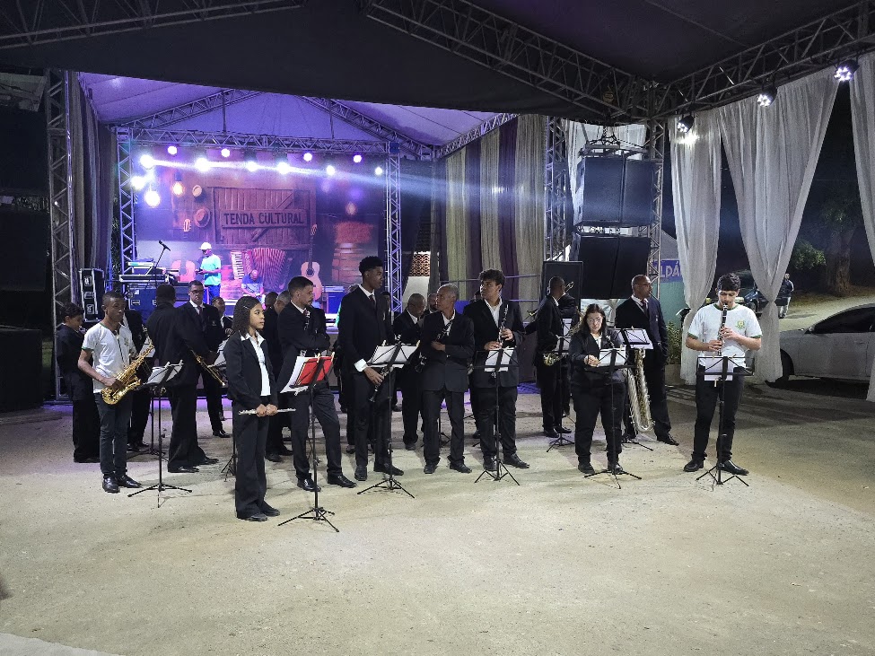 Sociedade Musical São João Batista se preparando para executar os hinos Nacional e de Macuco durante a Solenidade Oficial de Abertura da Expo-2025