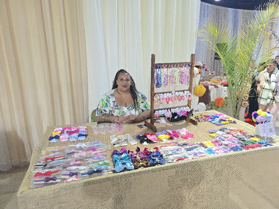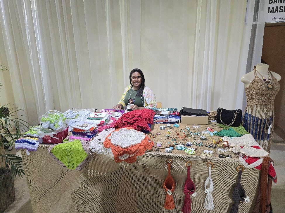 Expositora feliz na área destinada ao artesanato mostrando a qualidade do seu trabalho que pode ser alvo de tosos os visitantes