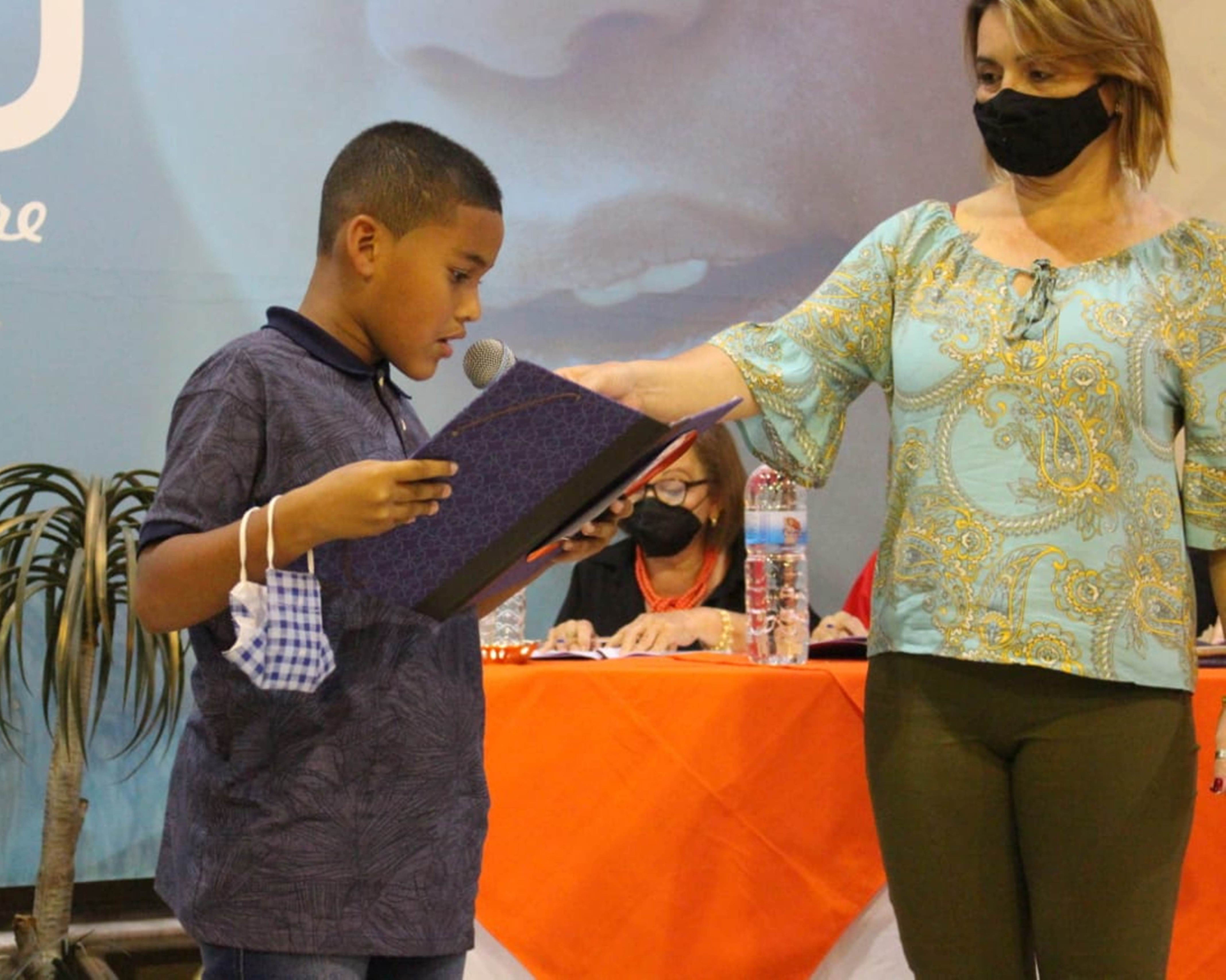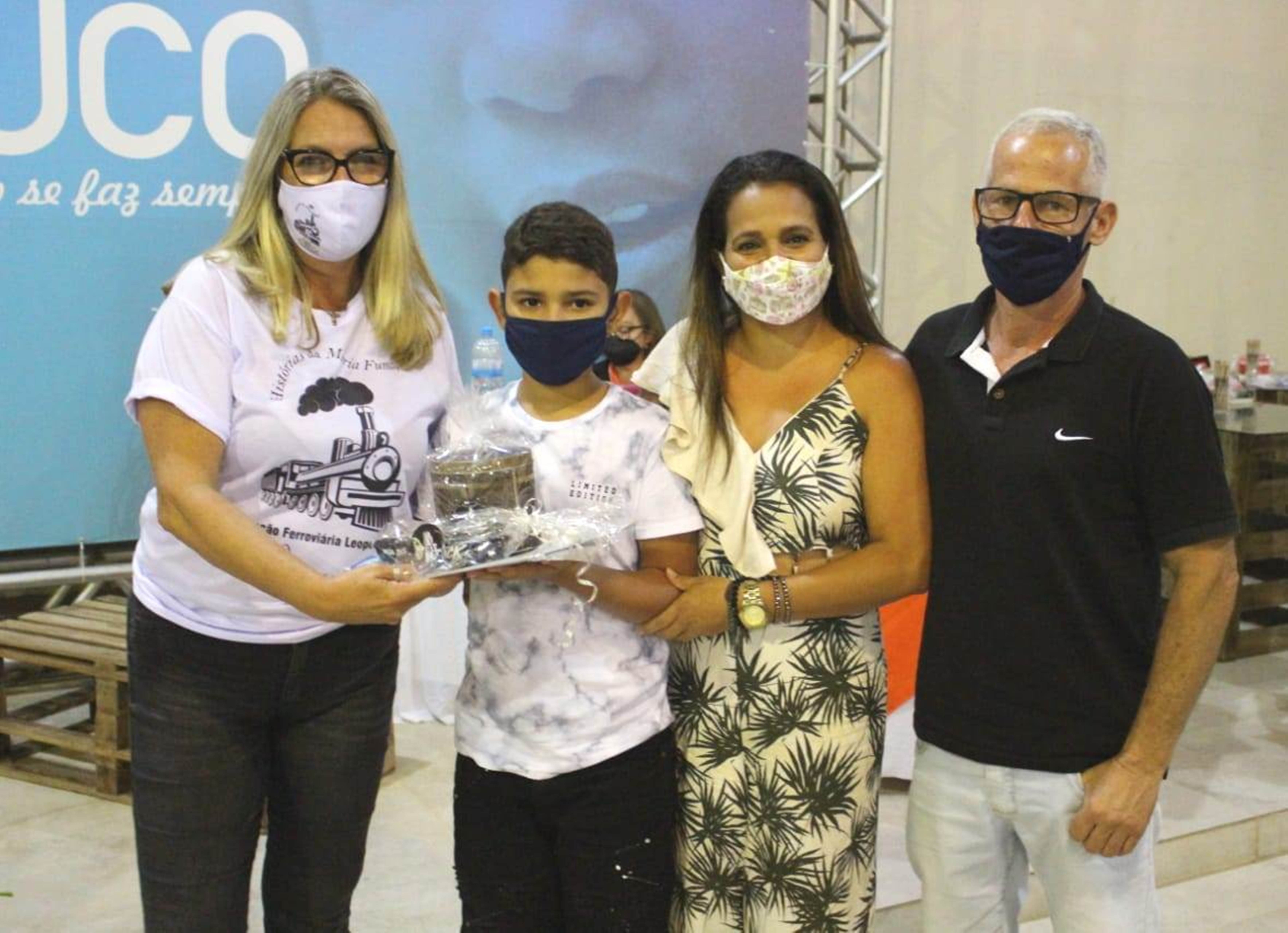 Arthur Leonardo ficou em terceiro lugar na Categoria 4º Ano e comemorou a colocação recebendo o prêmio ao lado da professora e familiares