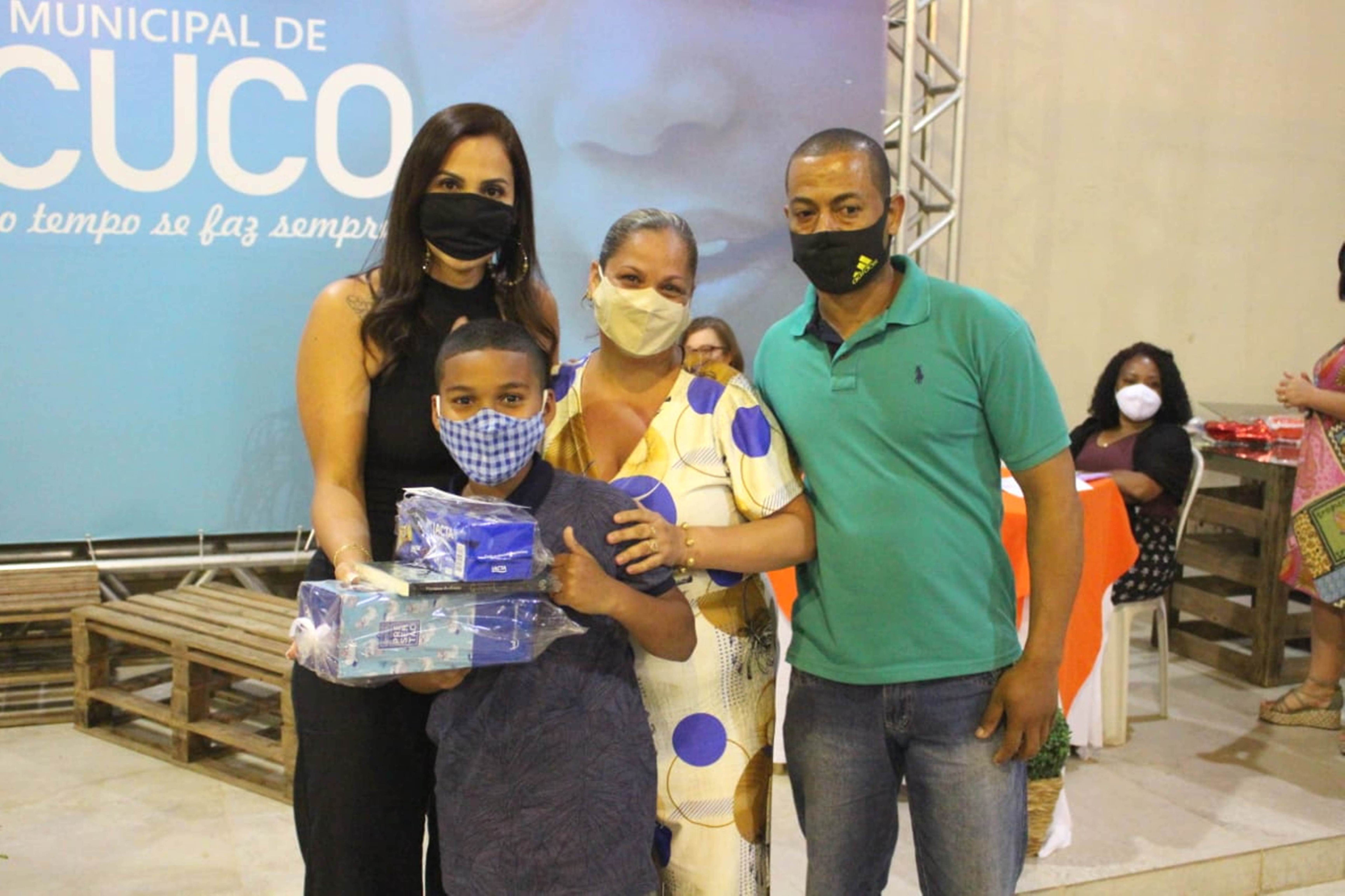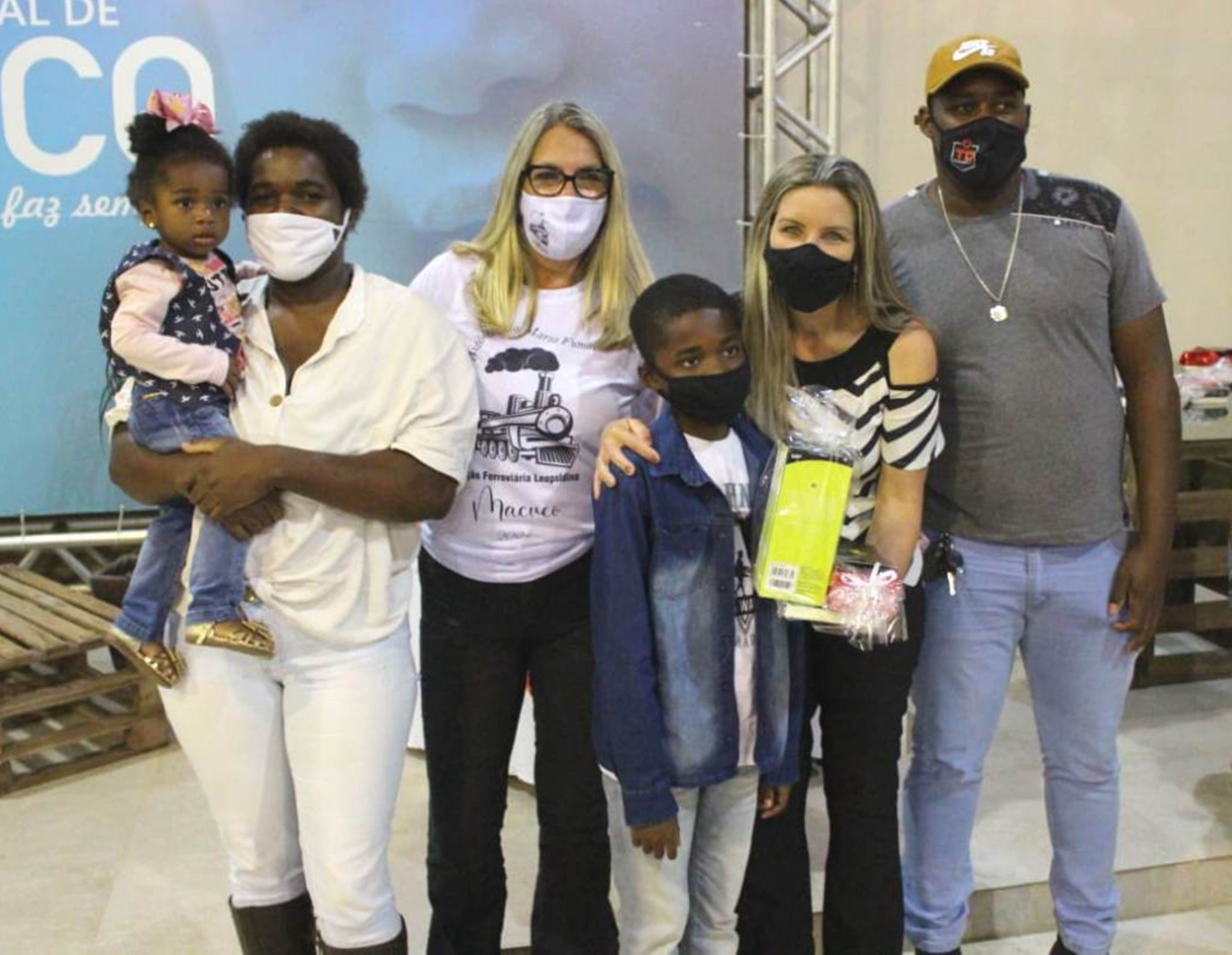 Victor Hugo, seus familiares e professora quando o menino recebeu a premiação das mãos da vice-prefeita Michelle Bianchini