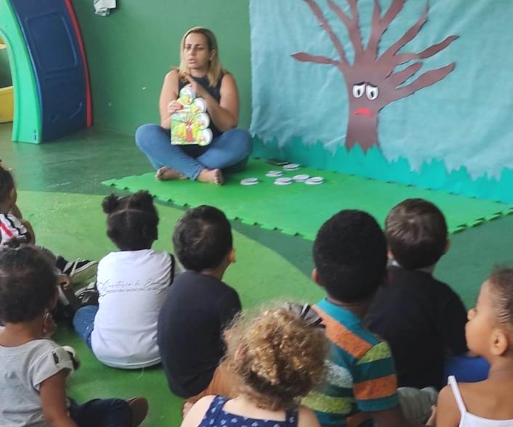 Professora Fernanda Santos, da Creche Municipal Zilda Bianchini, que encantou a garotada contando a história sobre a chegada da primavera