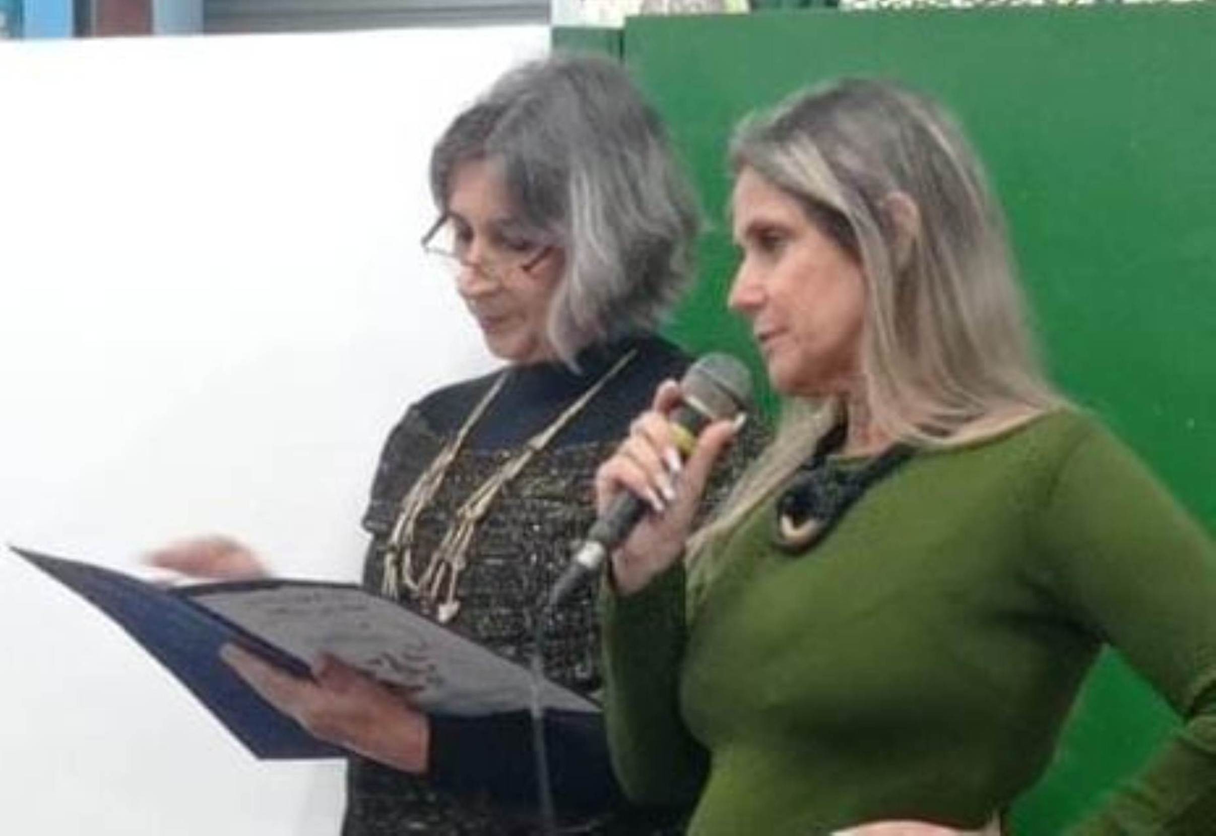 Secretária de Educação Claudia Vogas ao lado da diretor Zelândia Golinelli durante atividade no CIEP Honório Peçanha