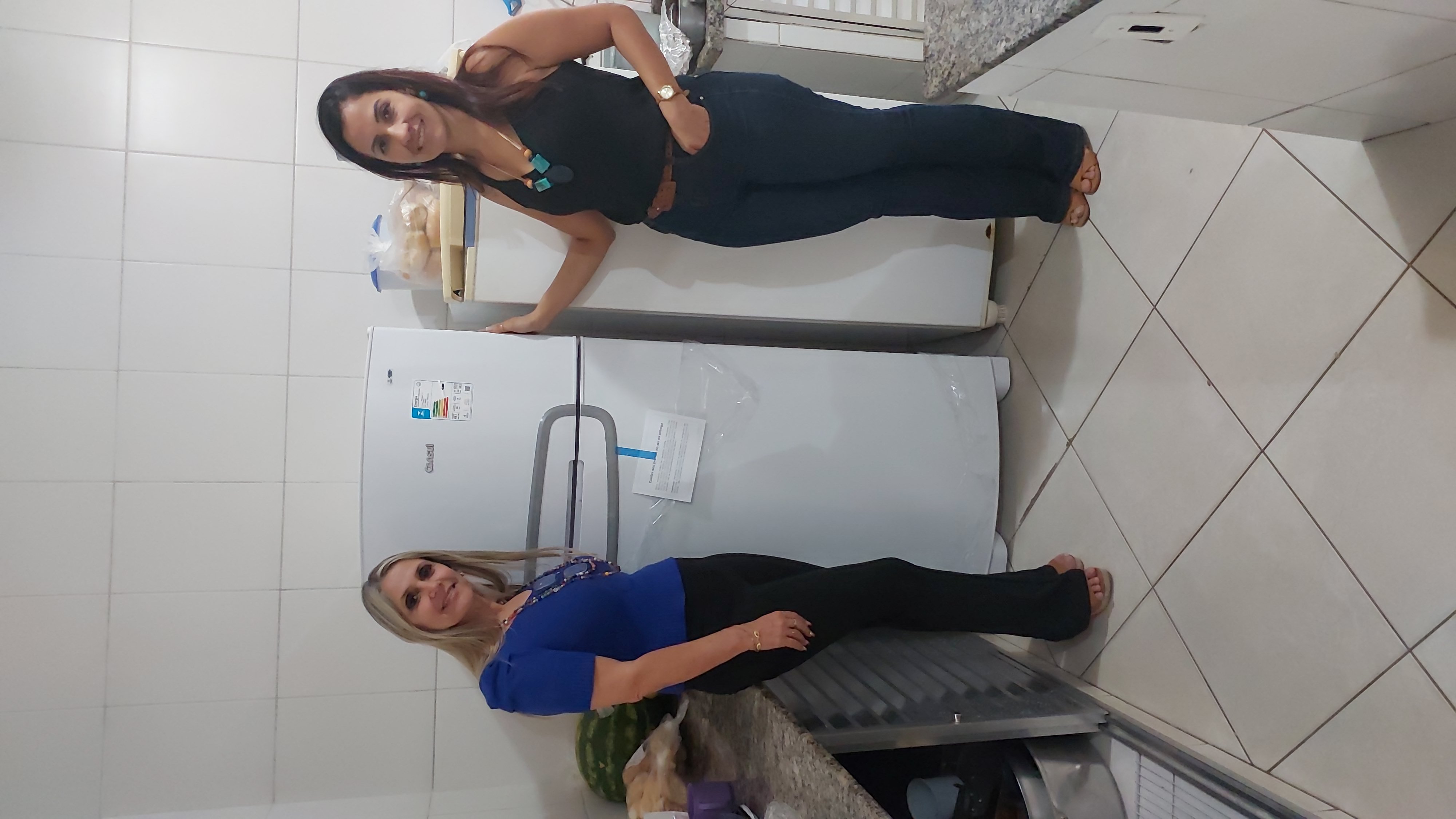 Secretária e diretora verificando o freezer horizontal que também vai integrar o patrimônio da Escola Sylvia Bath Rosas