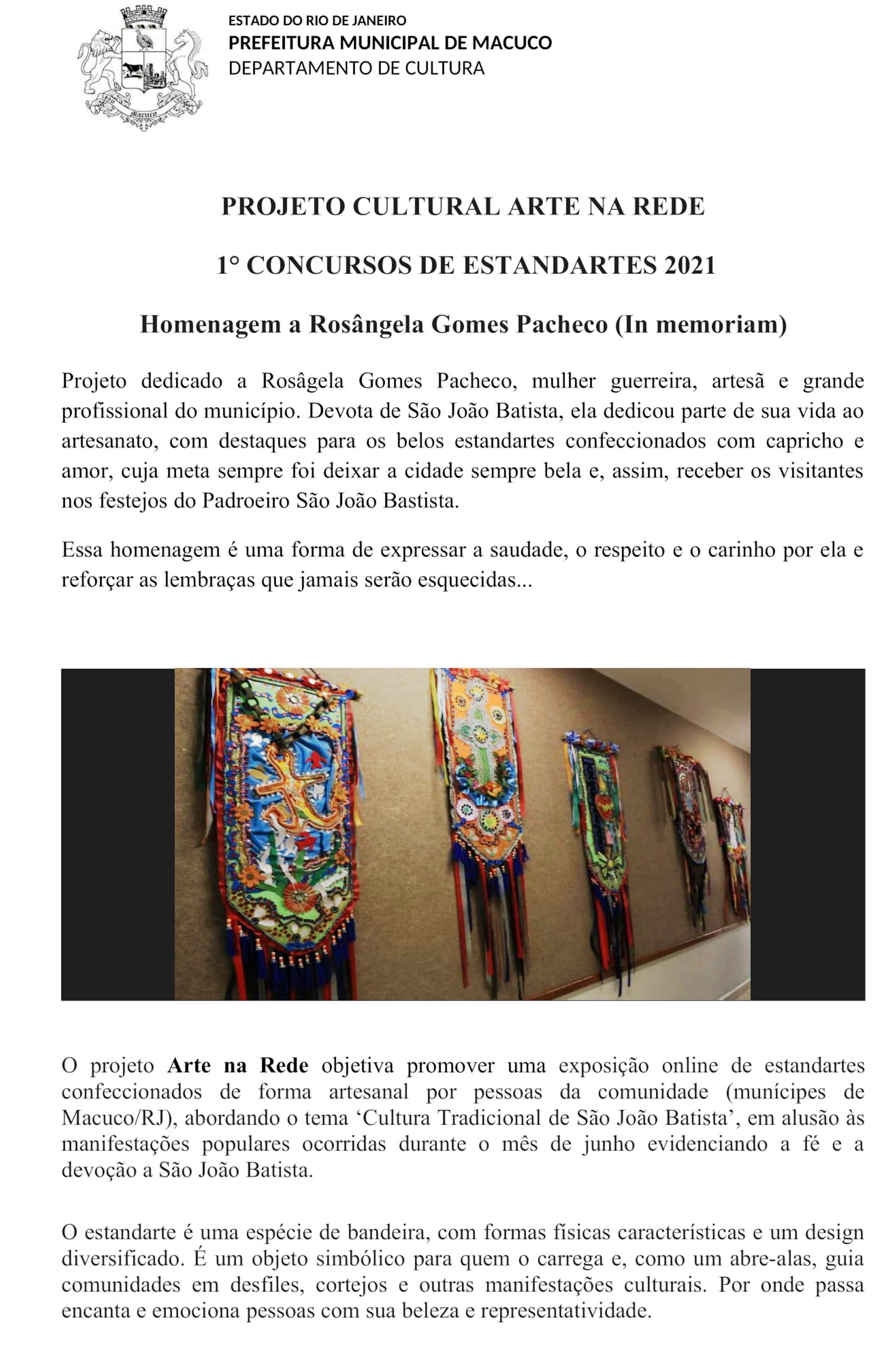 Pensando em evidenciar a data, valorizar e expor o trabalho dos artesãos macuquenses, o Departamento de Cultura lançou o projeto ‘Arte na Rede’, que promoverá o 1º Concurso de Estandartes e, posteriormente, uma exposição online de estandartes confeccionados artesanalmente por artistas da comunidade, tendo como tema exatamente a cultura tradicional dos festejos do padroeiro São João Batista.