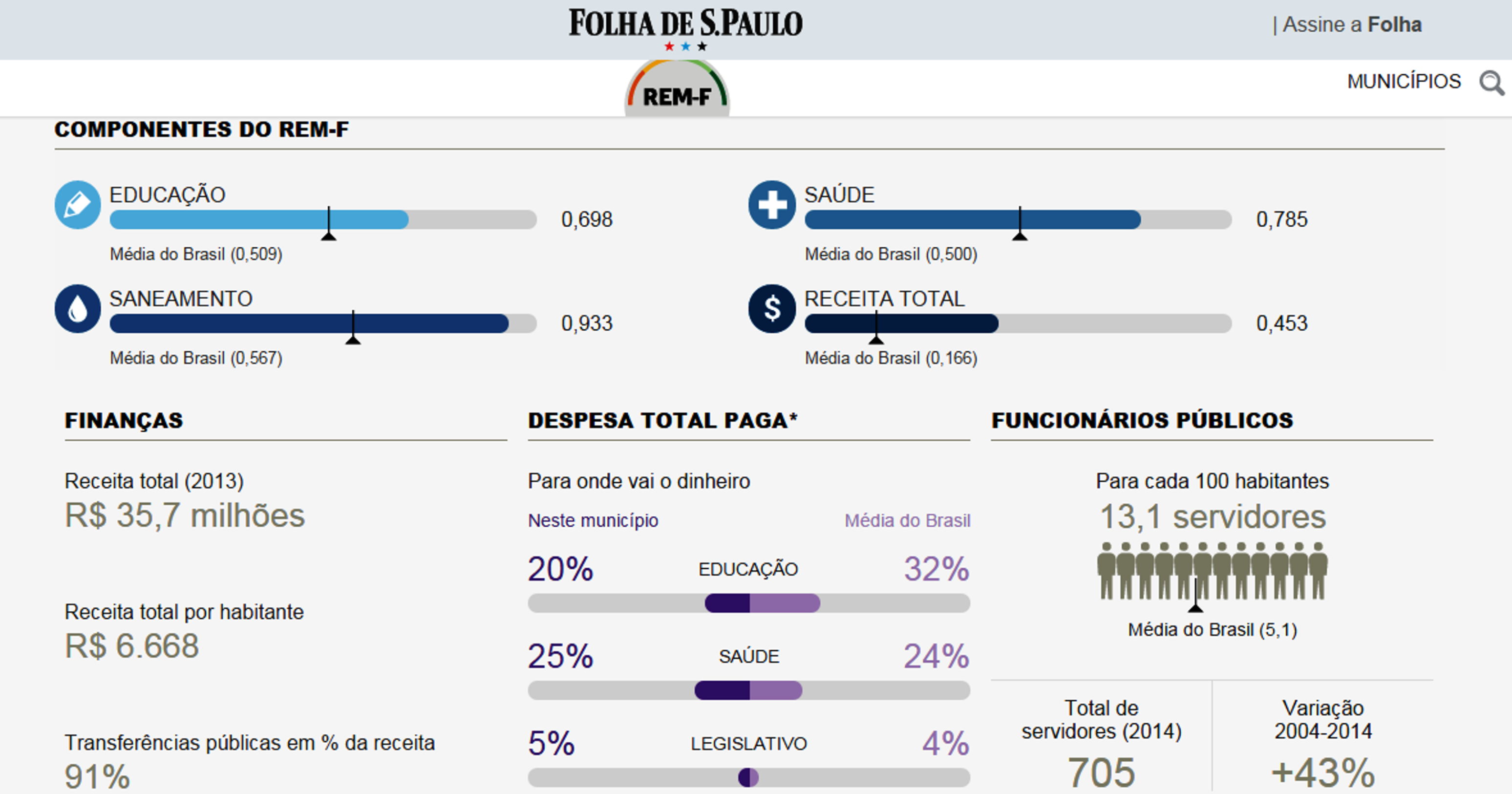 Um trabalho inédito lançado em parceria pela Folha de São Paulo e o Instituto Datafolha avaliou durante um ano o desempenho das prefeituras brasileiras com o objetivo de conhecer as que oferecem mais serviços básicos à população utilizando menor volume de recursos financeiros. Trata-se do Ranking de Eficiência dos Municípios (REM-F), que leva em conta indicadores de saúde, educação e saneamento para calcular a eficiência da gestão em 5.281 municípios, ou 95% do total de 5.569.