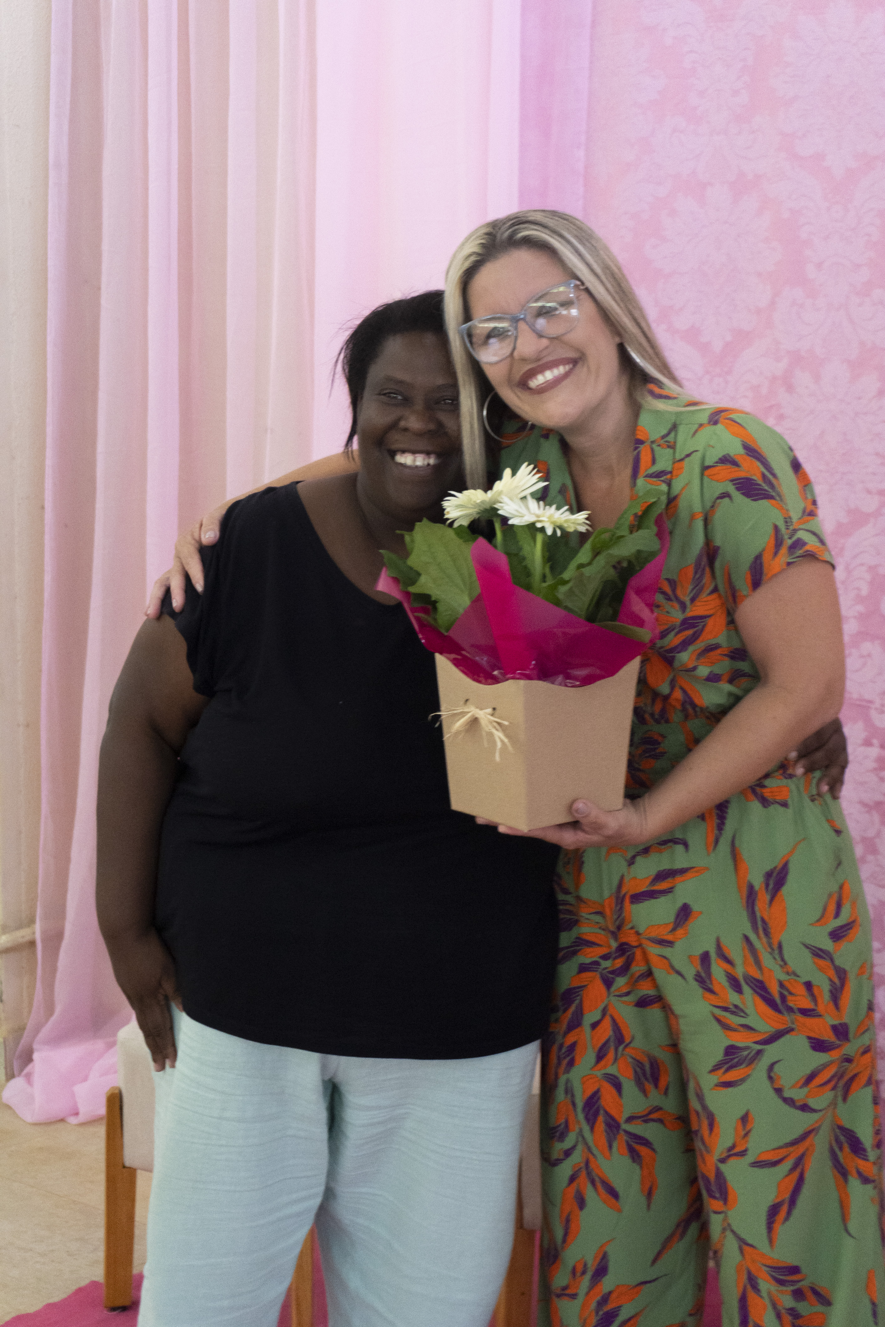 A secretária de Desenvolvimento Social, Tatiane Bormevet, recebendo o arranjo de flores