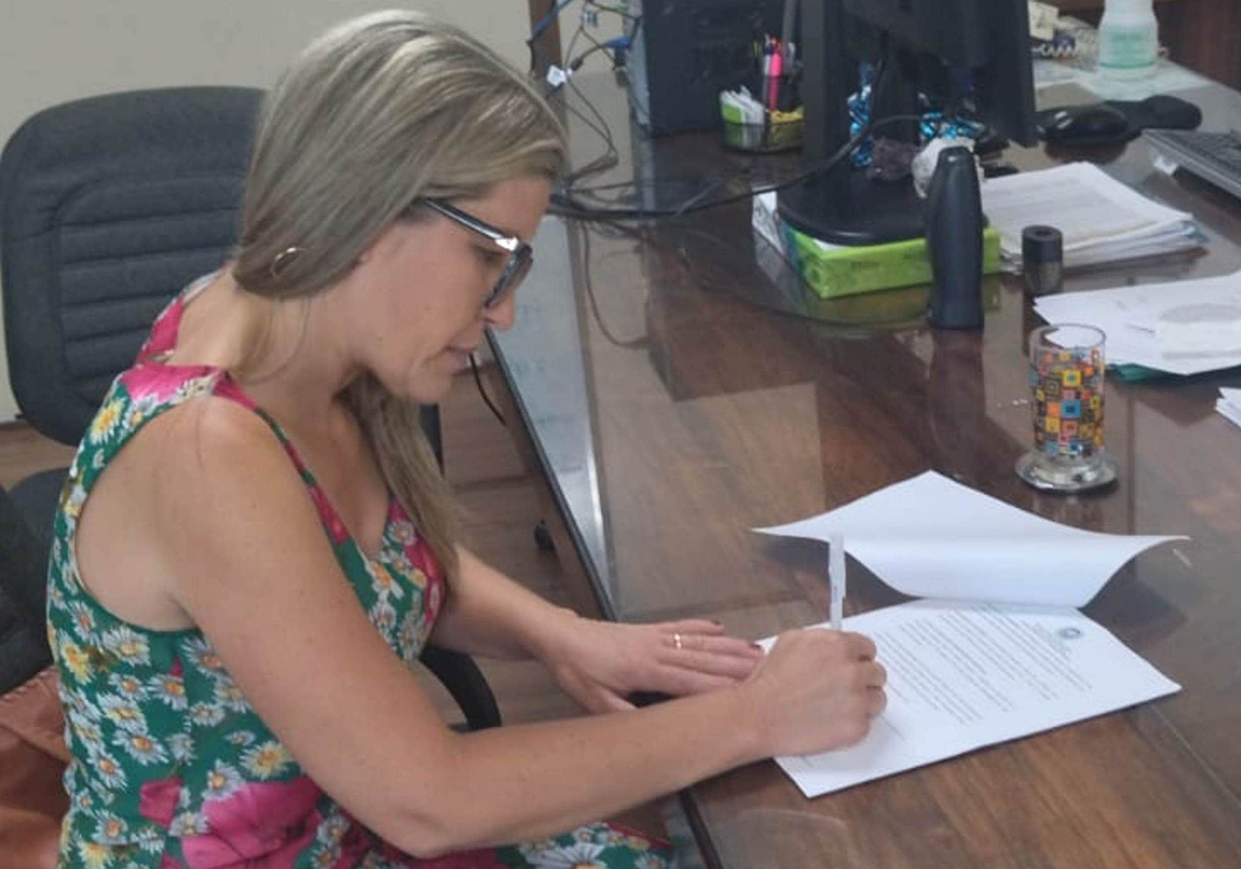 Prefeita Michelle Bianchini analisa a documentação que confirma o Termo Aditivo para Macuco receber os asfaltamentos do Governo do Estado