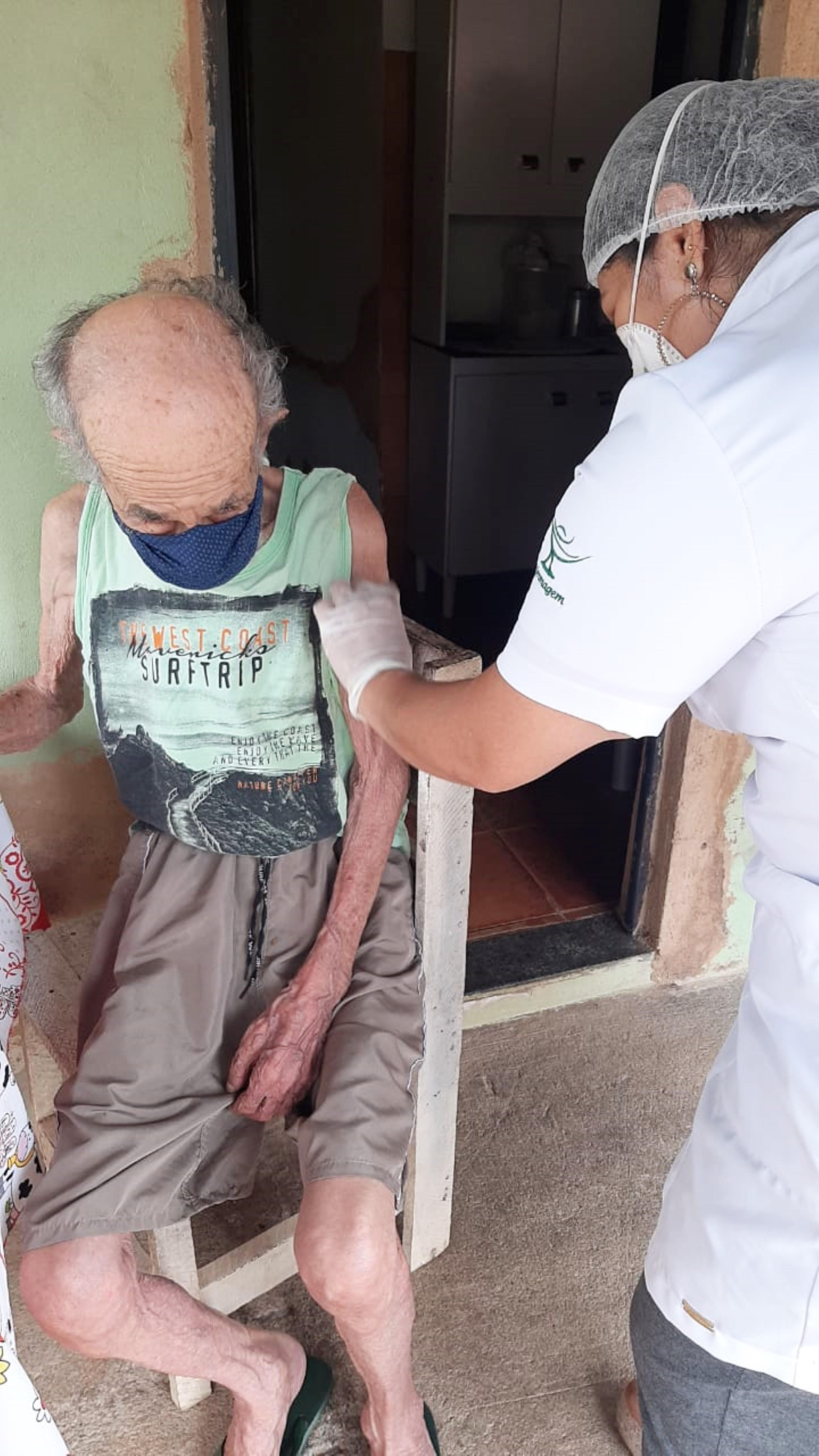 Vacina sendo aplicada pela profissional de saúde no senhor Jose Coelho Maia