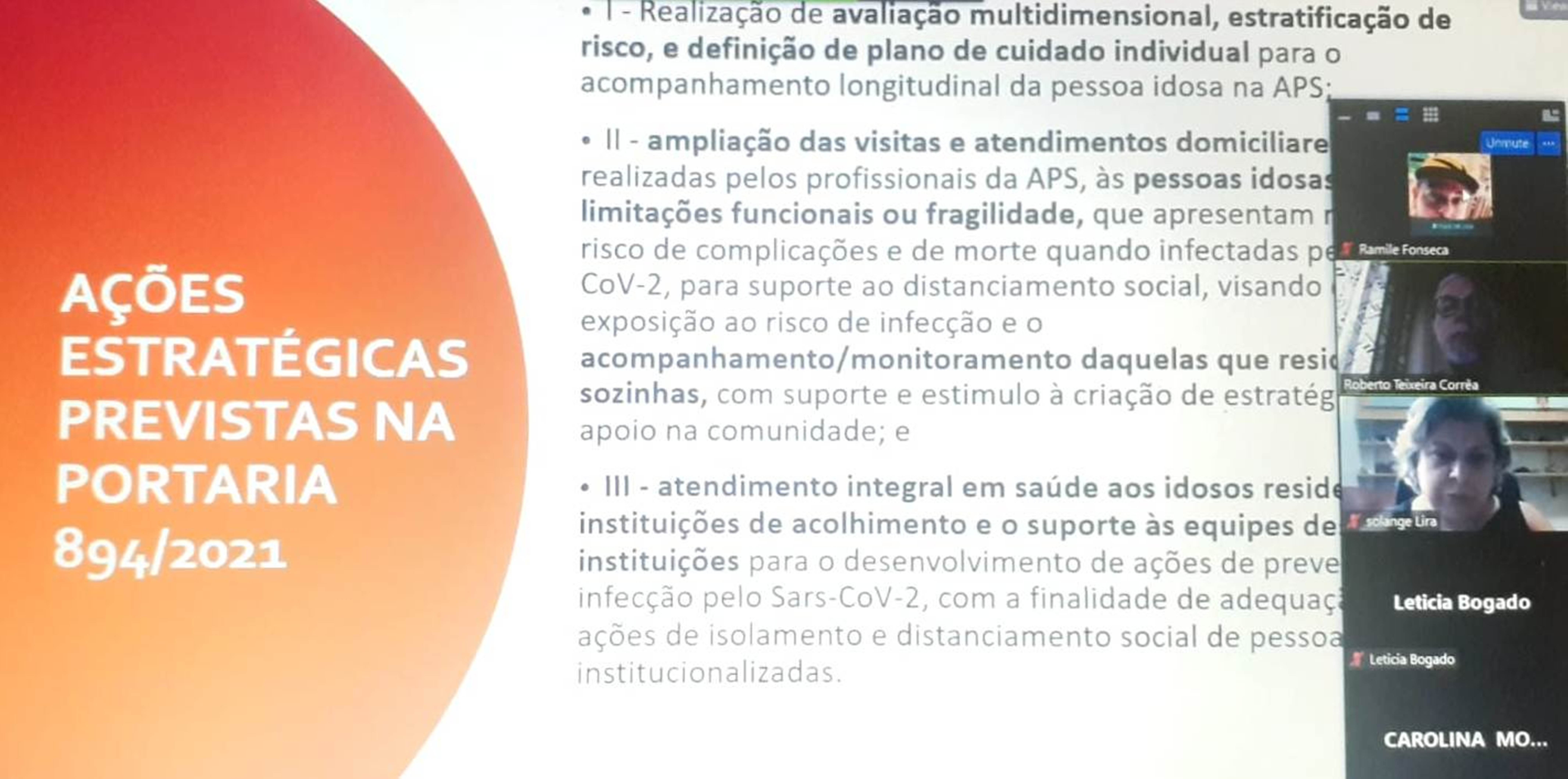 O encontro reforçou diferentes dimensões como condições de saúde, hábitos de vida, capacidade funcional, rede de apoio social e prática de atividade física e seus benefícios. “Também abordamos ações estratégicas previstas na portaria 894/21, entre elas avaliação multidimensional, estratificação de risco, definição de plano individual, ampliação de visitas e atendimentos domiciliares, atendimento integral aos idosos residentes em locais de acolhimento e avaliação clínica”, explicou Ramile.