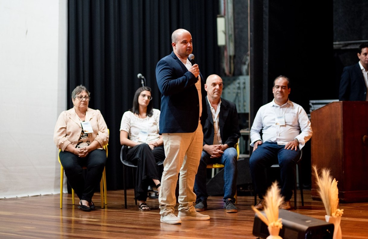 Deginar Boquimpani (à esquerda) e representantes dos municípios regionais acompanhando um dos discursos de abertura da FEPRO