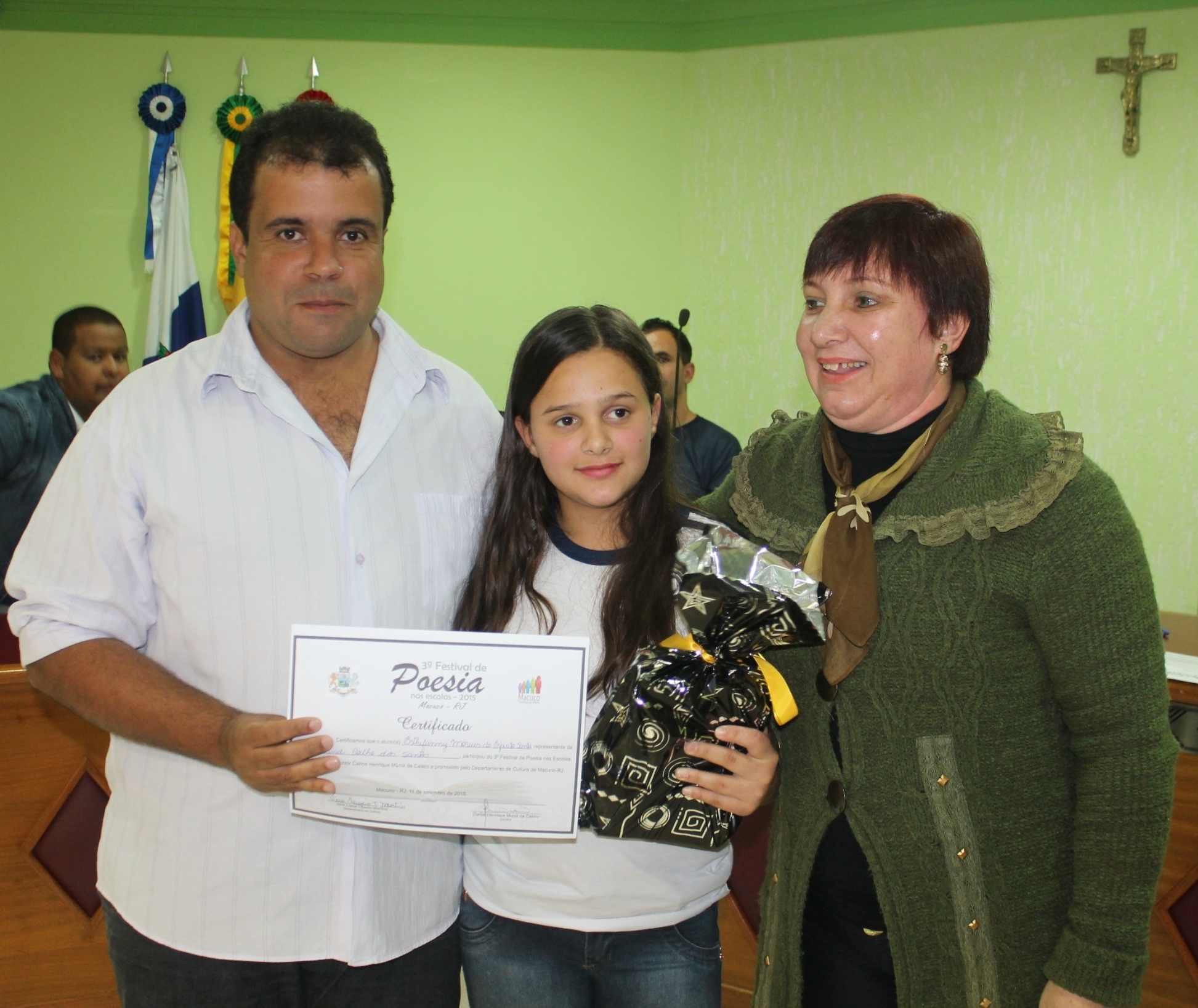 Na última sexta-feira, 11, foi realizada, no plenário da Câmara Municipal de Macuco, a cerimônia de premiação do 3º Festival Intermunicipal de Poesia, do qual participaram, em sua etapa local, os seguintes educandários macuquenses: Colégio Estadual José Carlos Boaretto, Colégio Estadual Farmacêutico Rodolfo Albino, Escola Municipal David Coelho dos Santos e Escola Municipal Sylvia Bath Rosas.