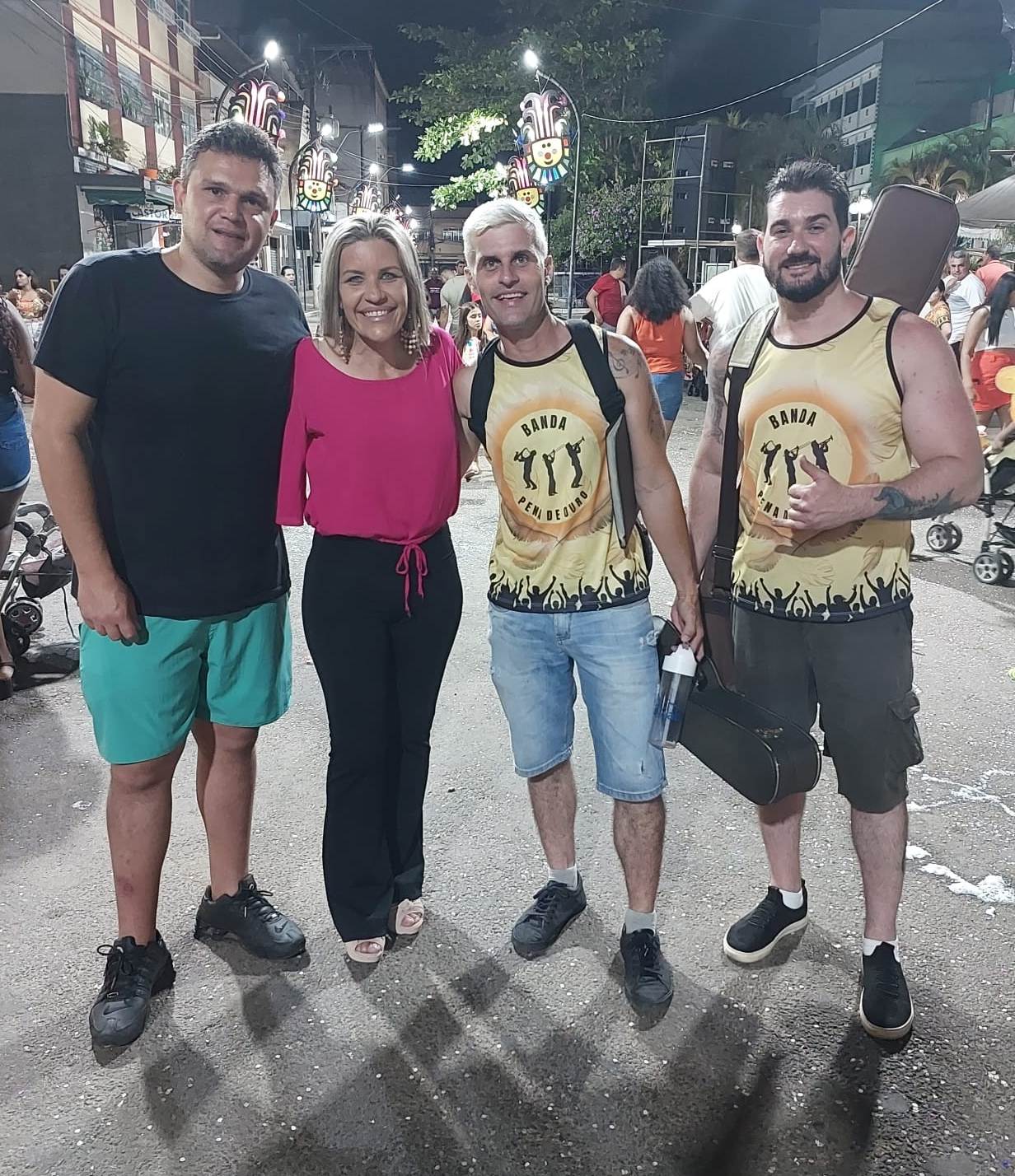 Michelle Bianchini e João Vitor com o irmão da prefeita Luigi Biscácio e outro músico da Banda Pena de Ouro