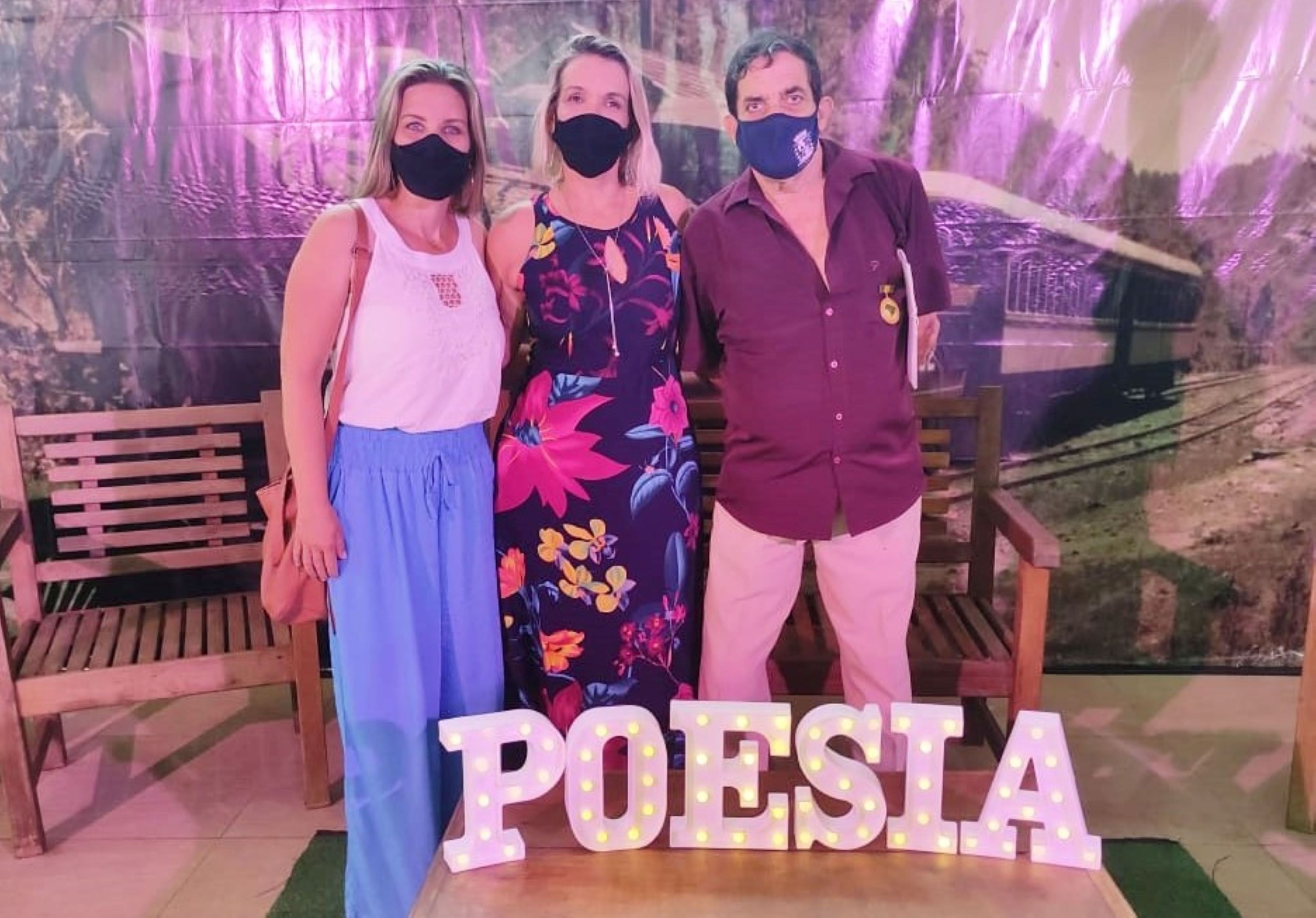 Michelle Bianchini e Luciana Boaretto ao lado do escritor, poeta e organizador do festival Carlos Henrique Muniz de Castro