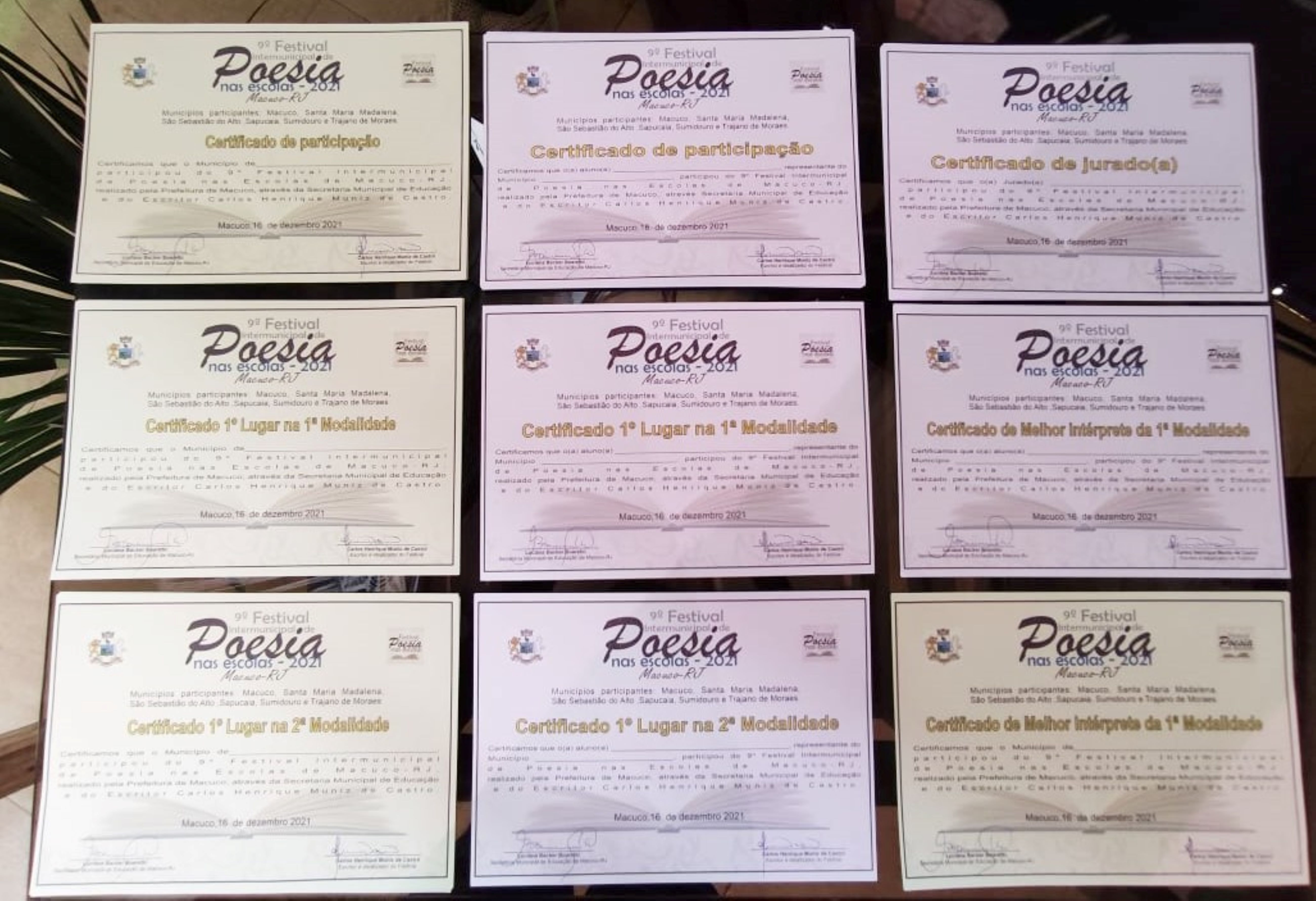 Todos os vencedores de suas respectivas categorias receberam um certificado alusivo à participação no ‘9º Festival Intermunicipal de Poesias nas Escolas’