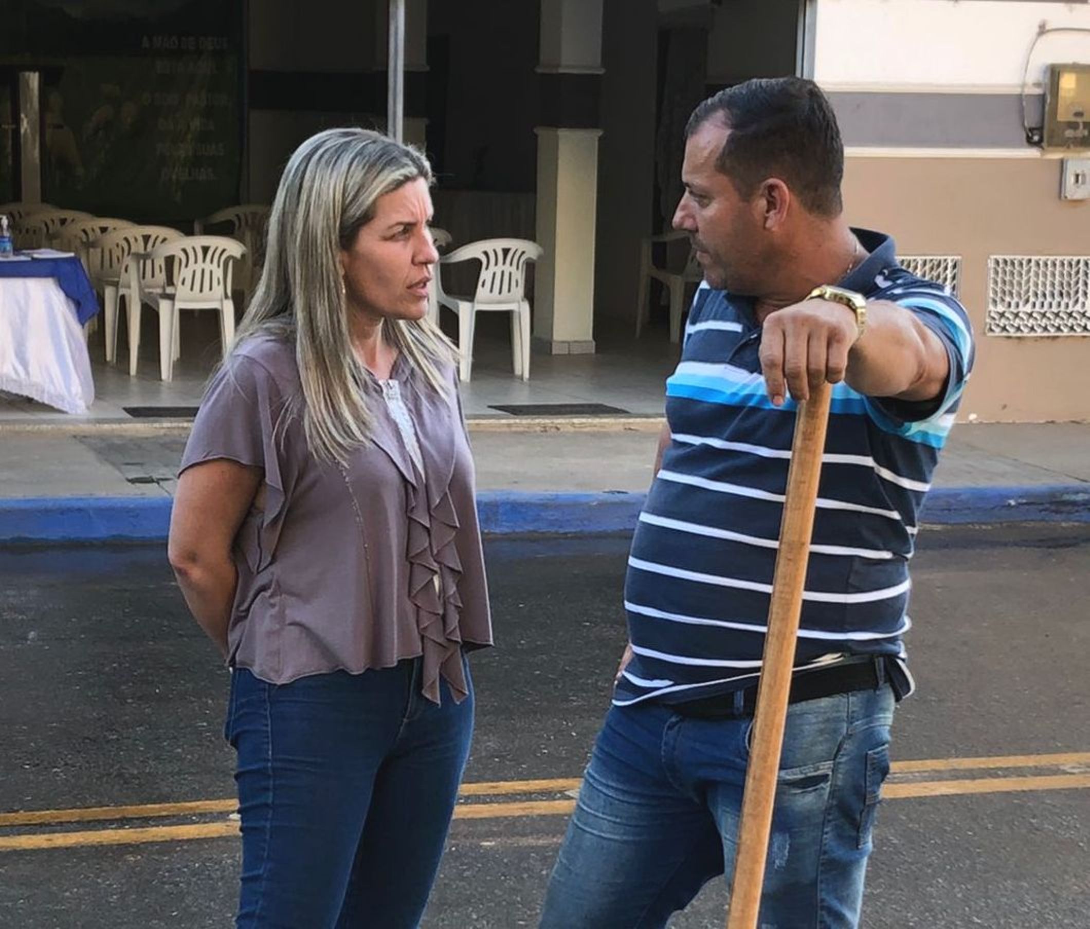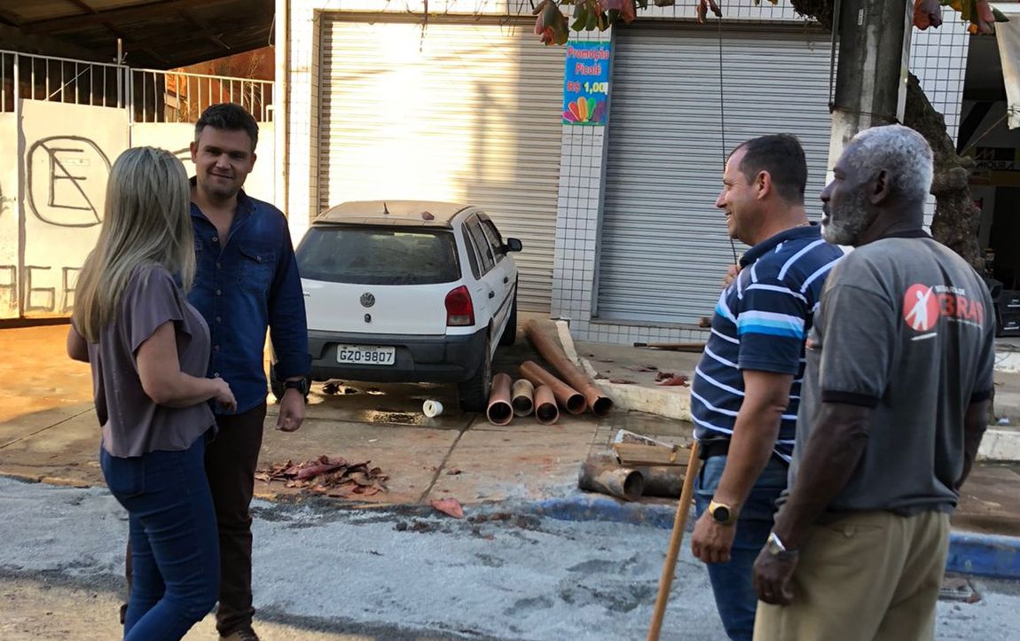 Prefeita Michelle conversa com o esposo João Vitor observada pelo secretário de Obras e um servidor municipal