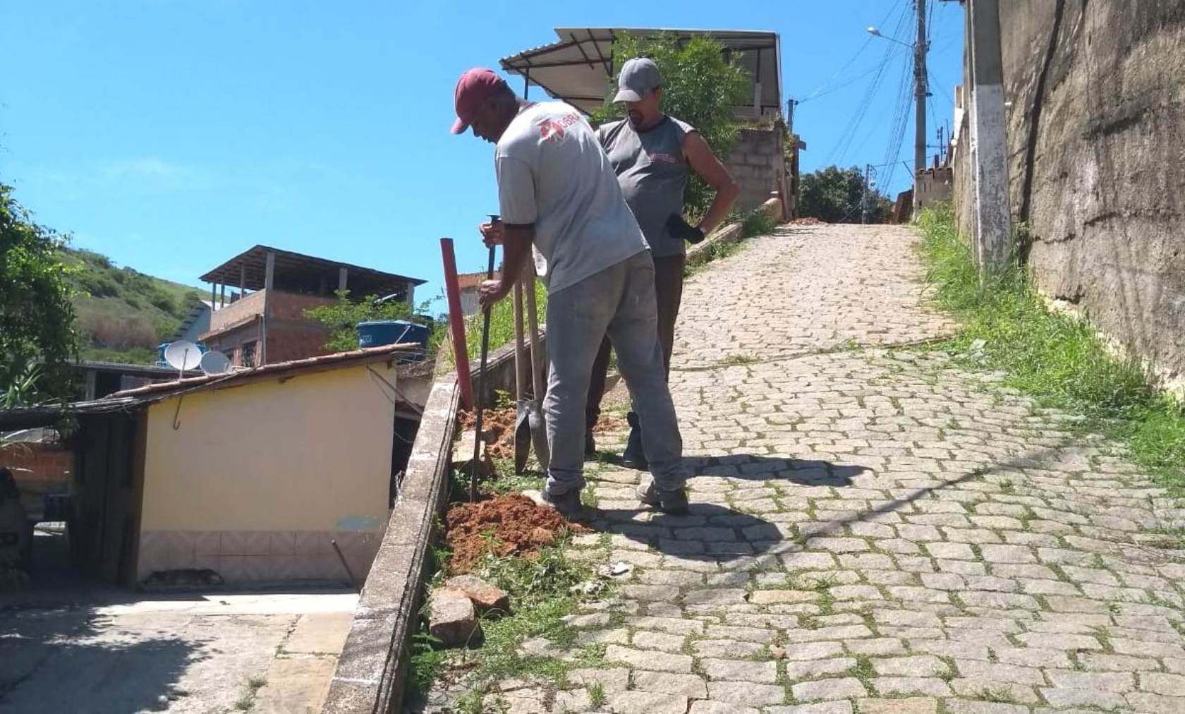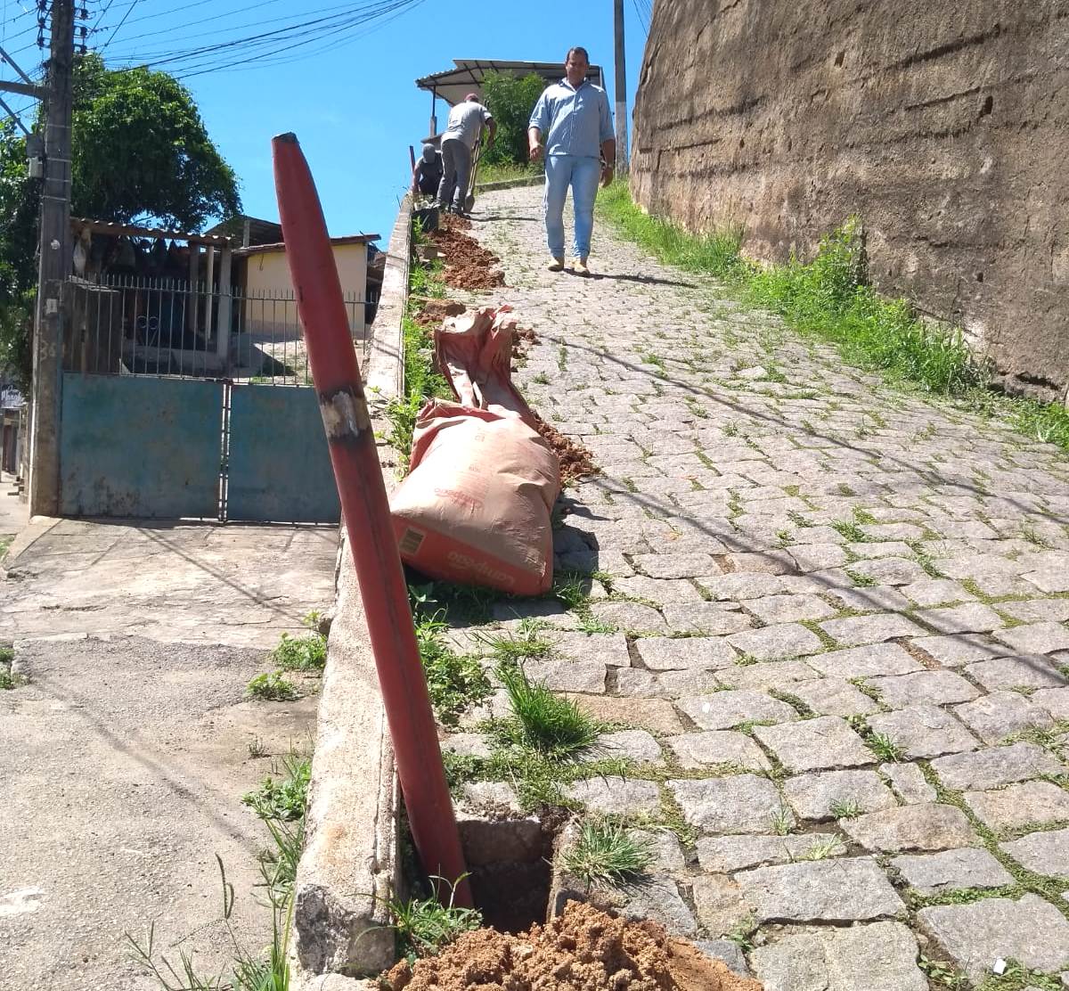 Funcionários da Secretaria de Obras ainda durante a escavação para fixar as barras de sustentação dos corrimãos