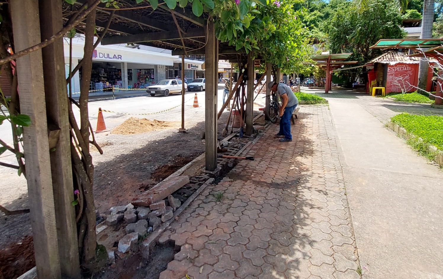 Equipe de obras reassentando o piso num dos trechos próximos à Câmara Municipal, sede do Poder Legislativo de Macuco