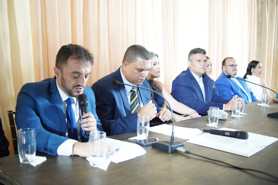 Vereador mais votado do município, Alessanio Badini Joy (à esquerda) atuou como presidente em exercício da Câmara Municipal e comandou a Cerimônia de Posse