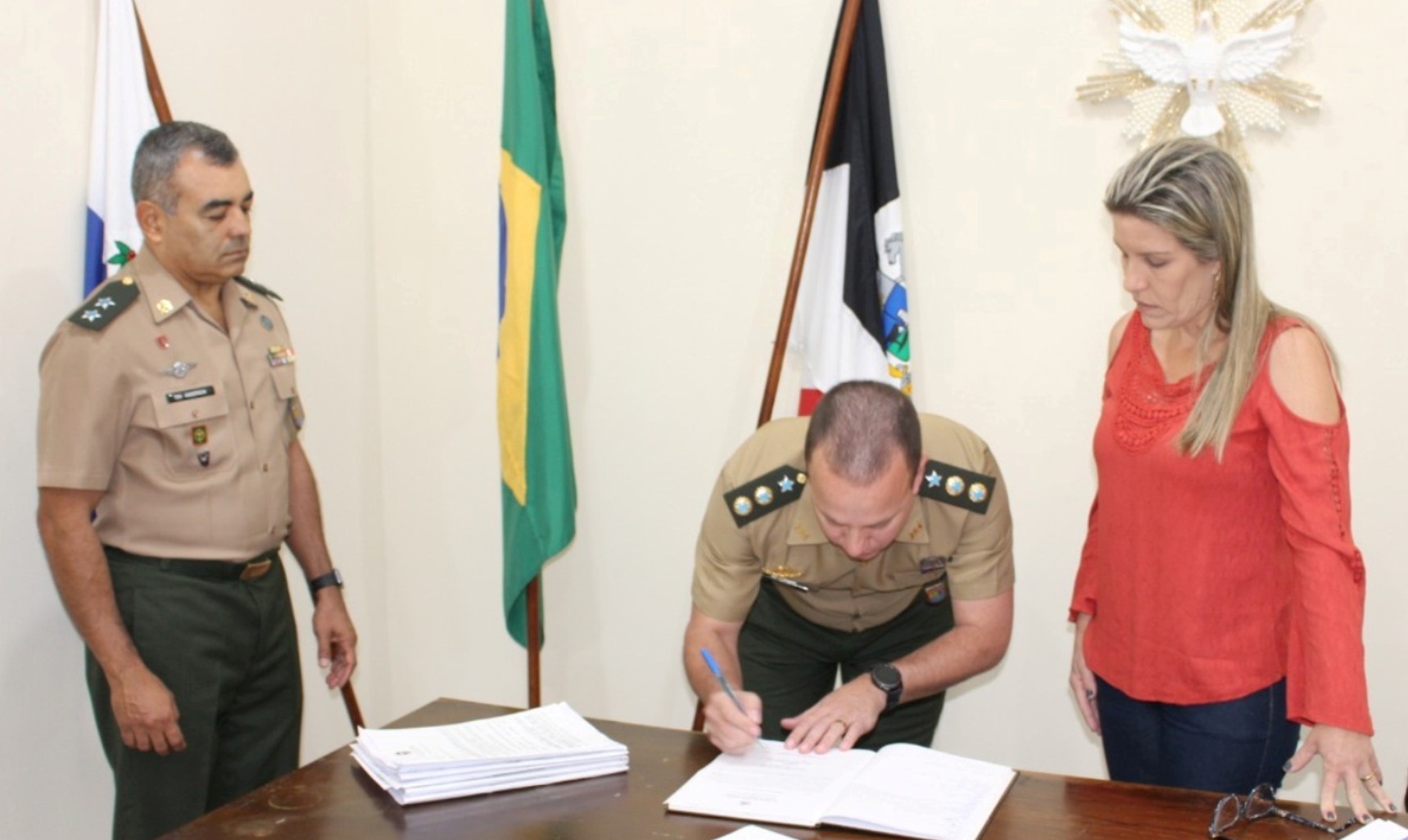 Tenente/Coronel Délcio Goulart sacramenta a posse de Michelle Bianchini assinando o documento oficial