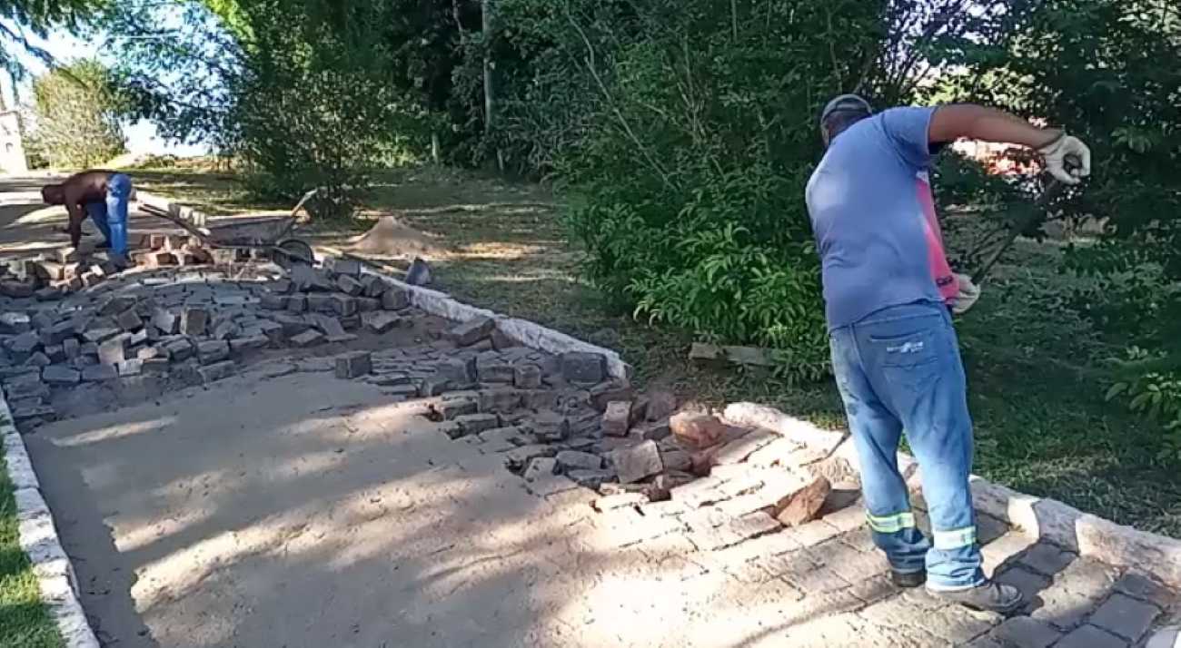 Calçamento sendo recuperado pela equipe numa rua do bairro Santos Reis