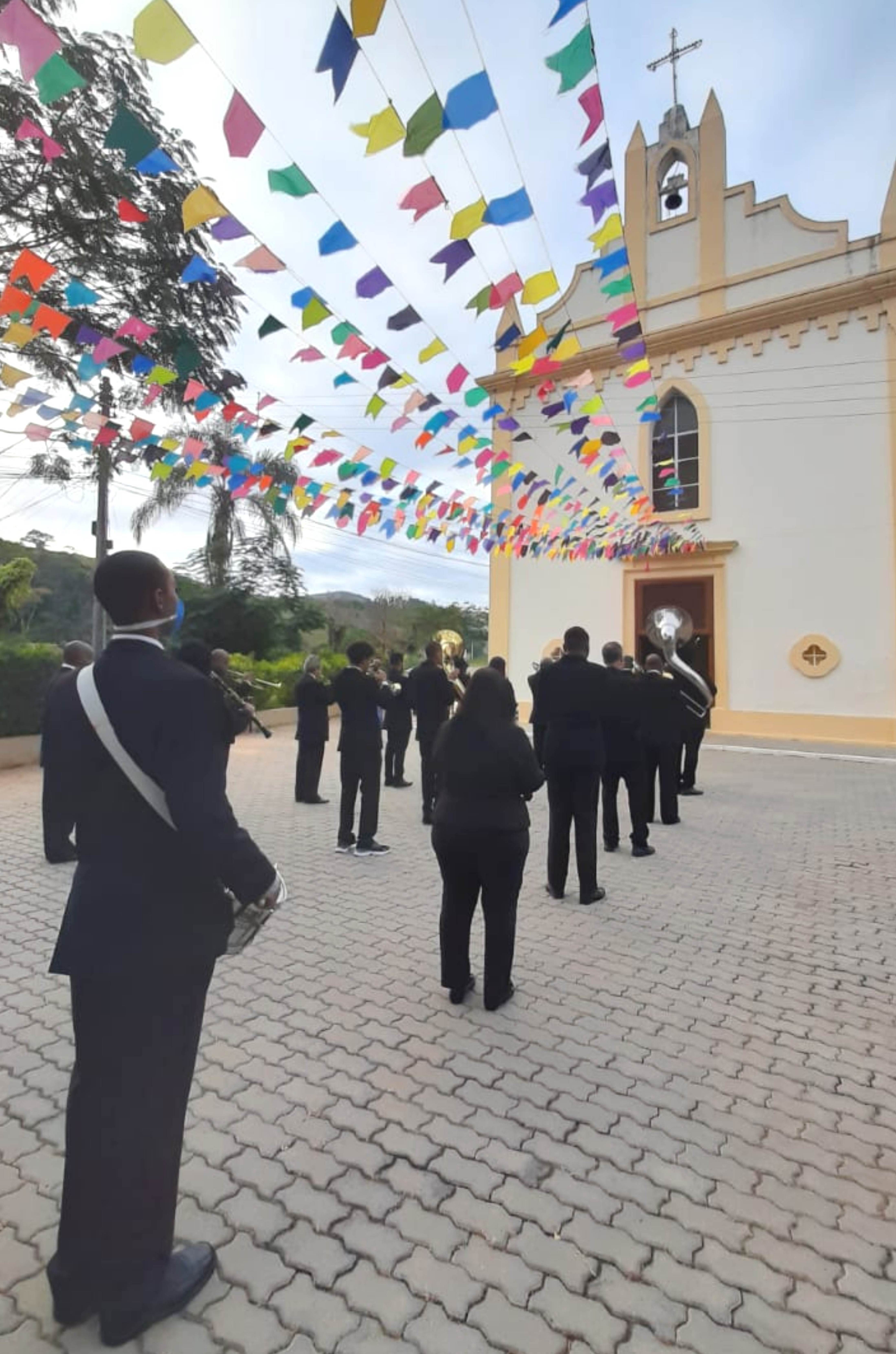 Diante da Igreja de São João Batista, músicos aguardam as orações do pároco