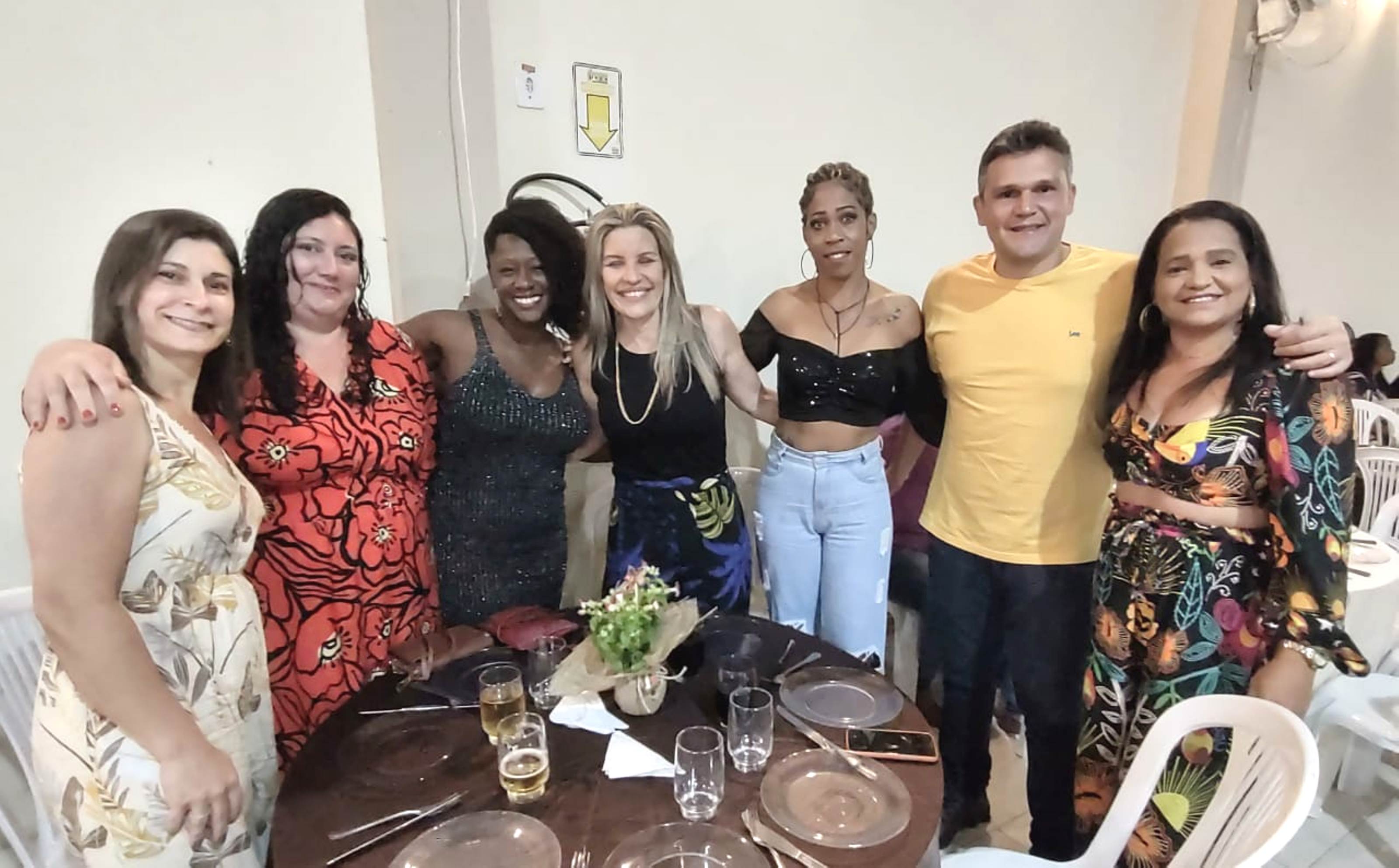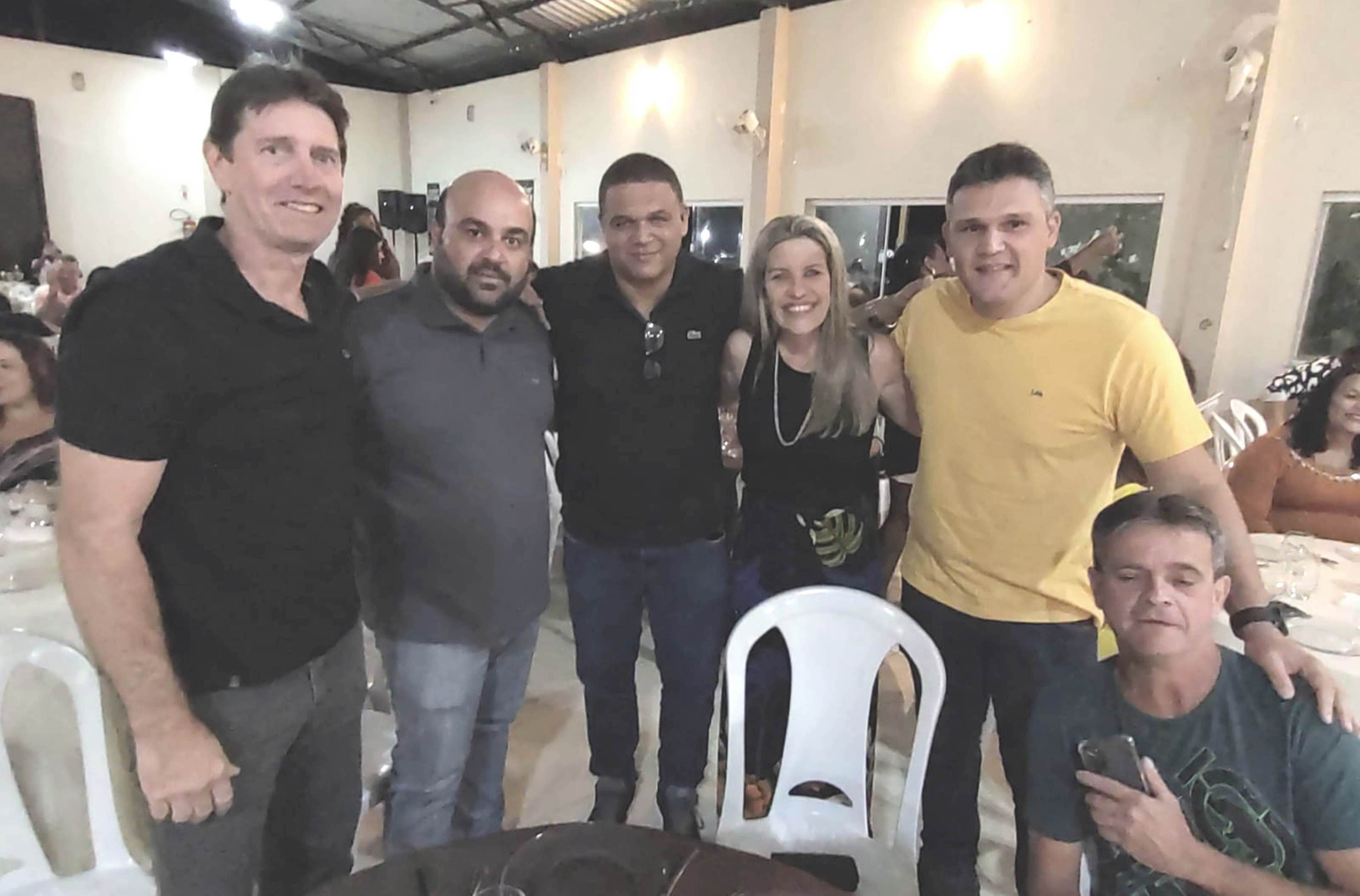 Michelle Bianchini e João Vitor Pontes entre os vereadores Bruno Miranda, Felipe Carvalho e Alberto Herdy durante o jantar