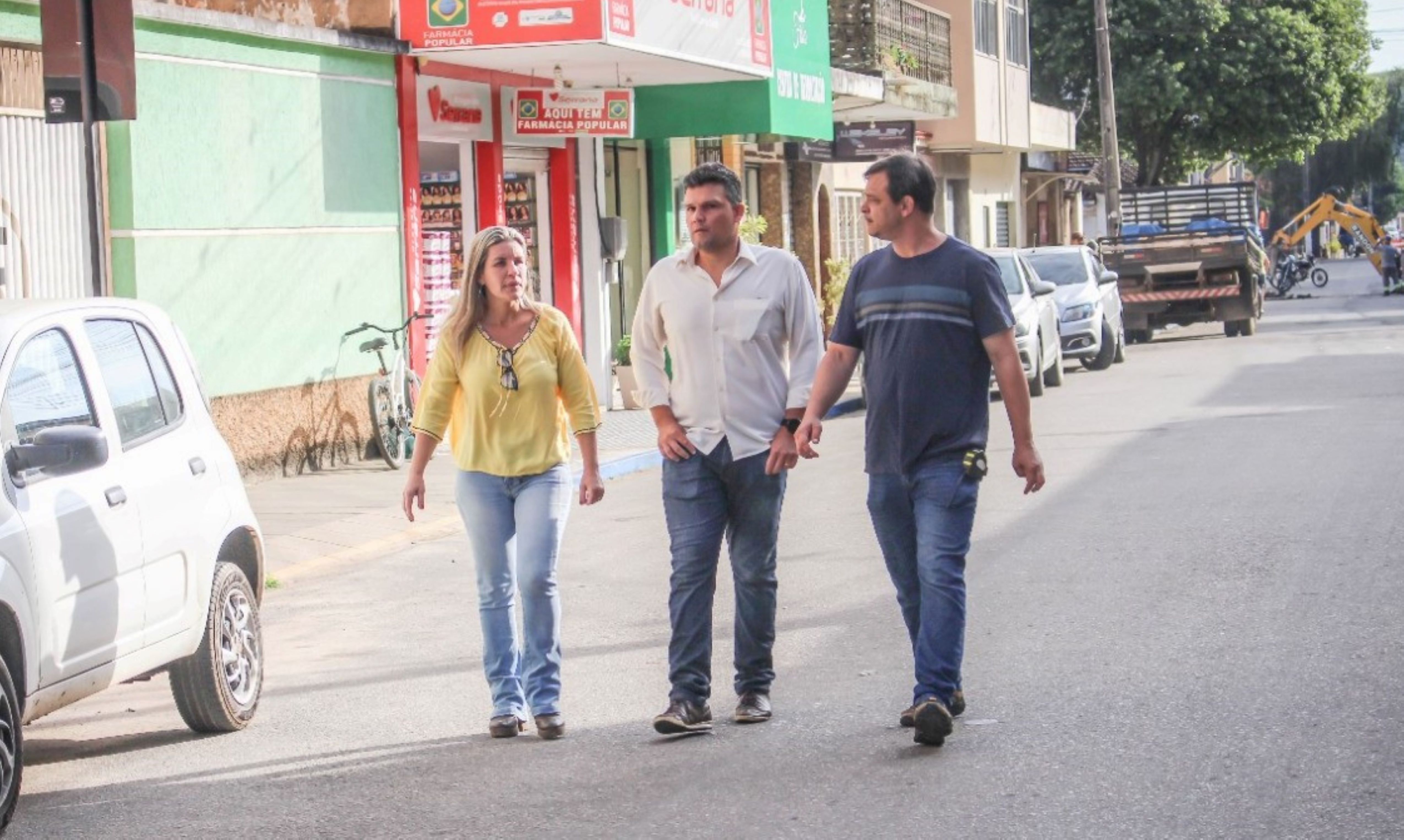 Prefeita, secretário e coordenador caminhando ao longo da via para conhecer melhor os benefícios das faixas elevadas