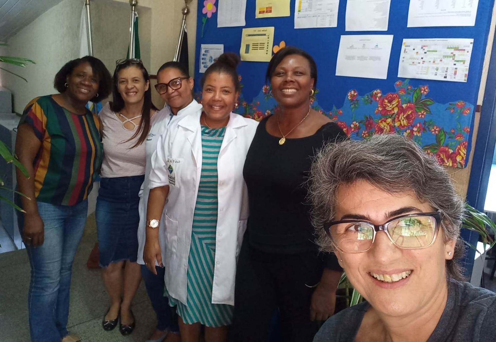 Selfie mostra o bom entrosamento entre os profissionais de educação e saúde, que têm caminhado de mãos dadas em Macuco