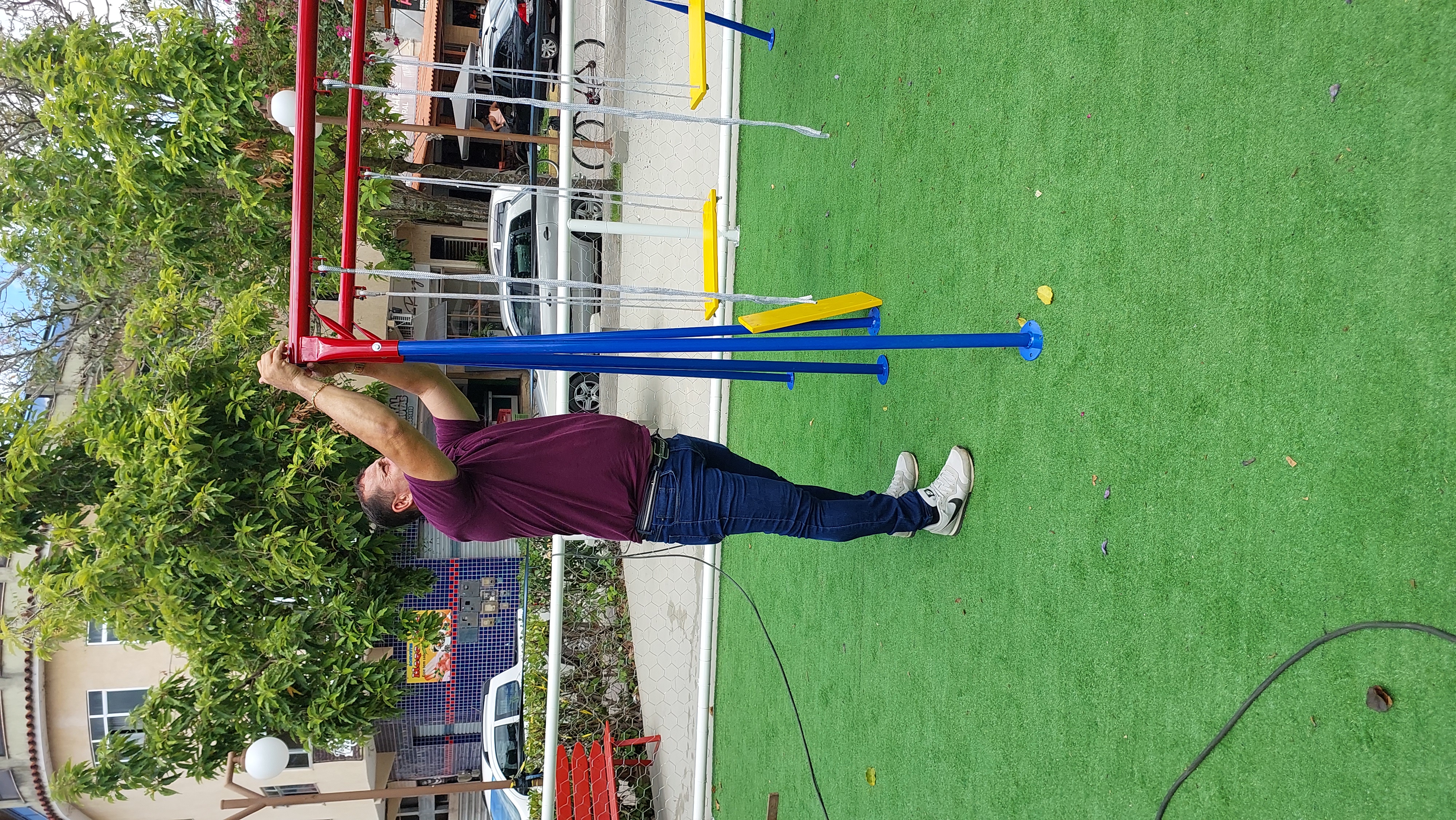 Marquinhos da Obra confere um dos portões do parquinho infantil antes que este receba as telas de proteção